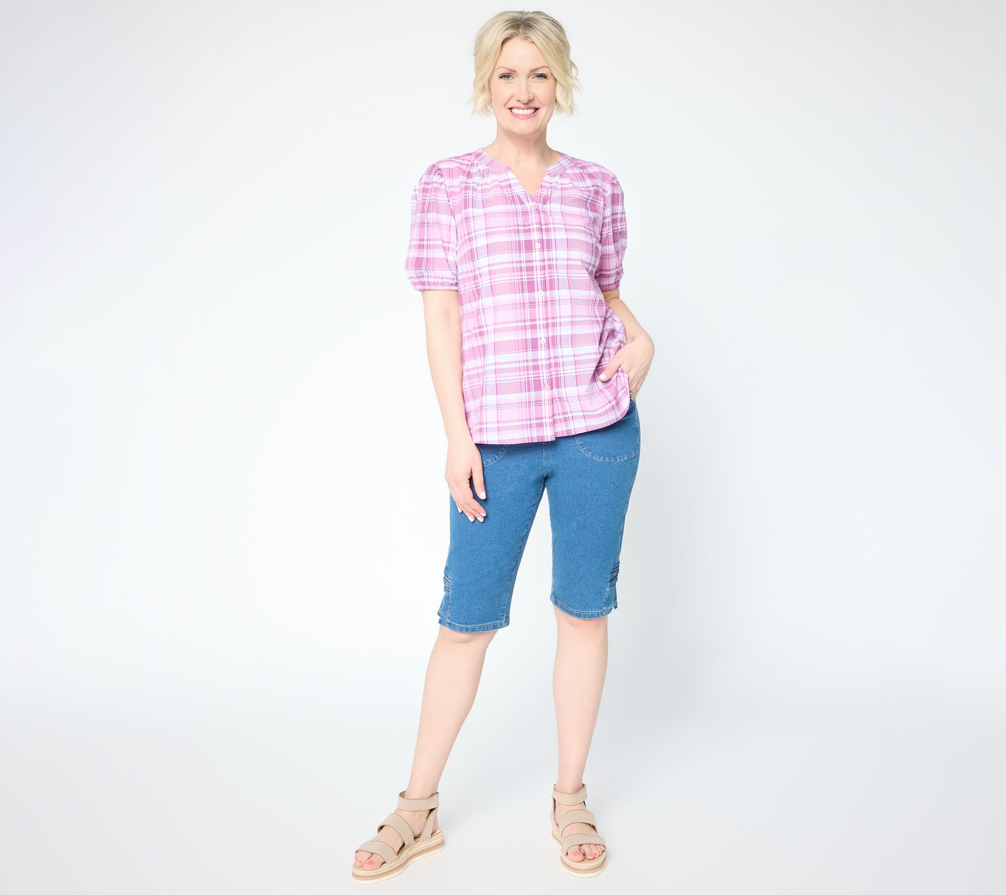 What's making us happy? Madras plaid -- and the soft all-cotton construction of this button-front top! Let its preppy feminine style sweeten your sunny weekdays and social Saturdays. From Denim & Co.® Fashions.