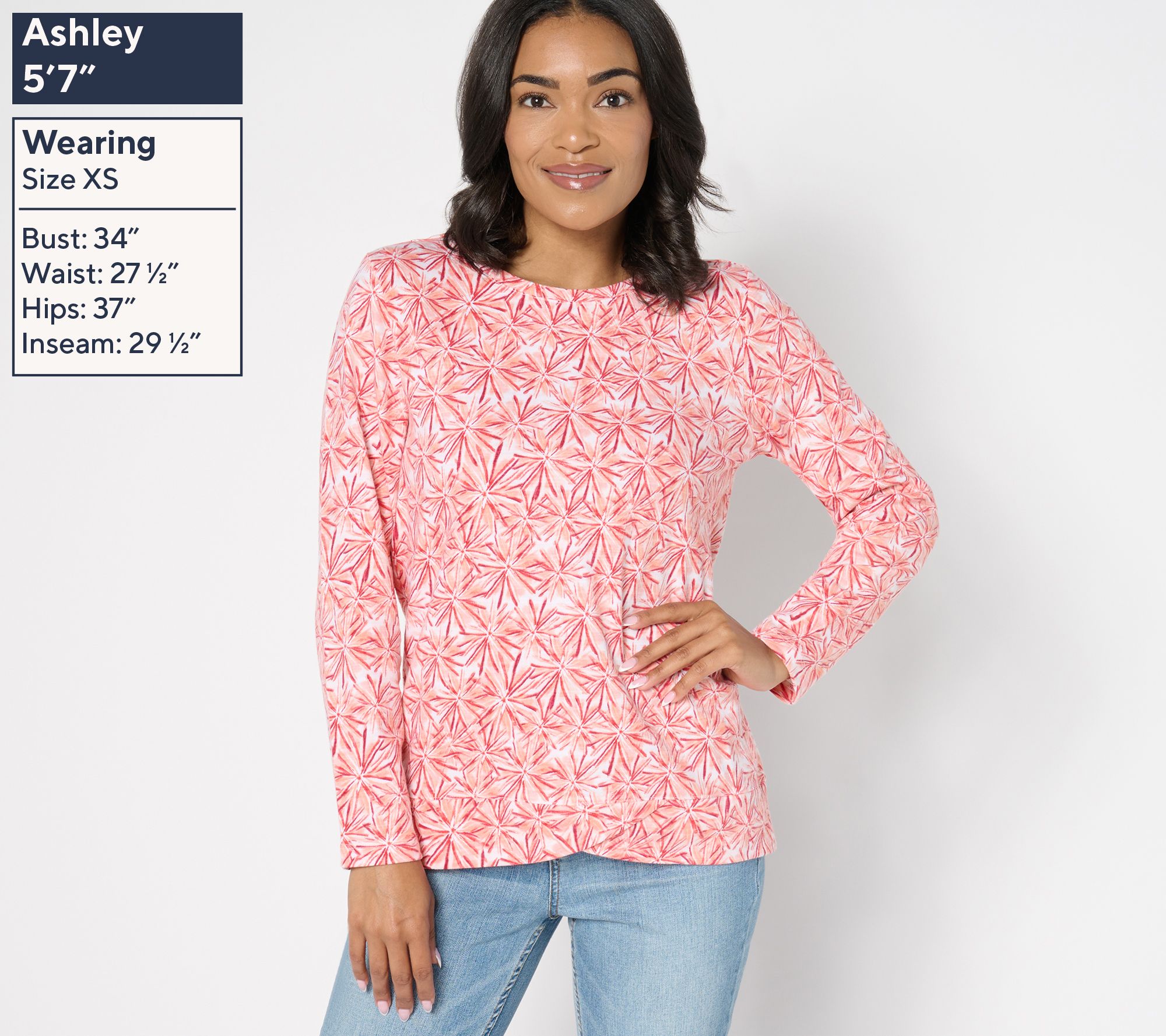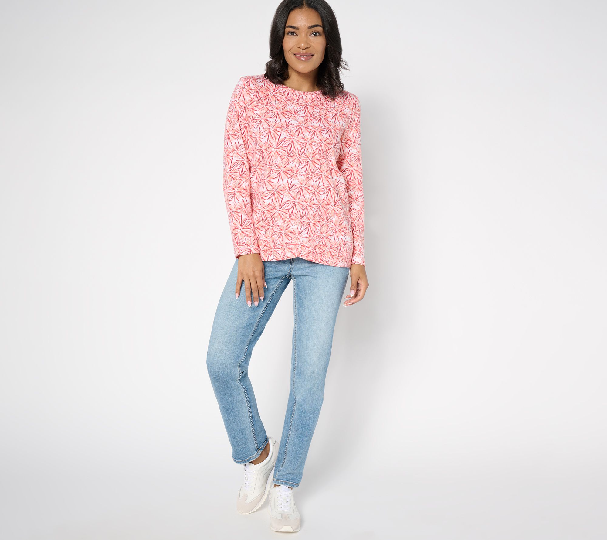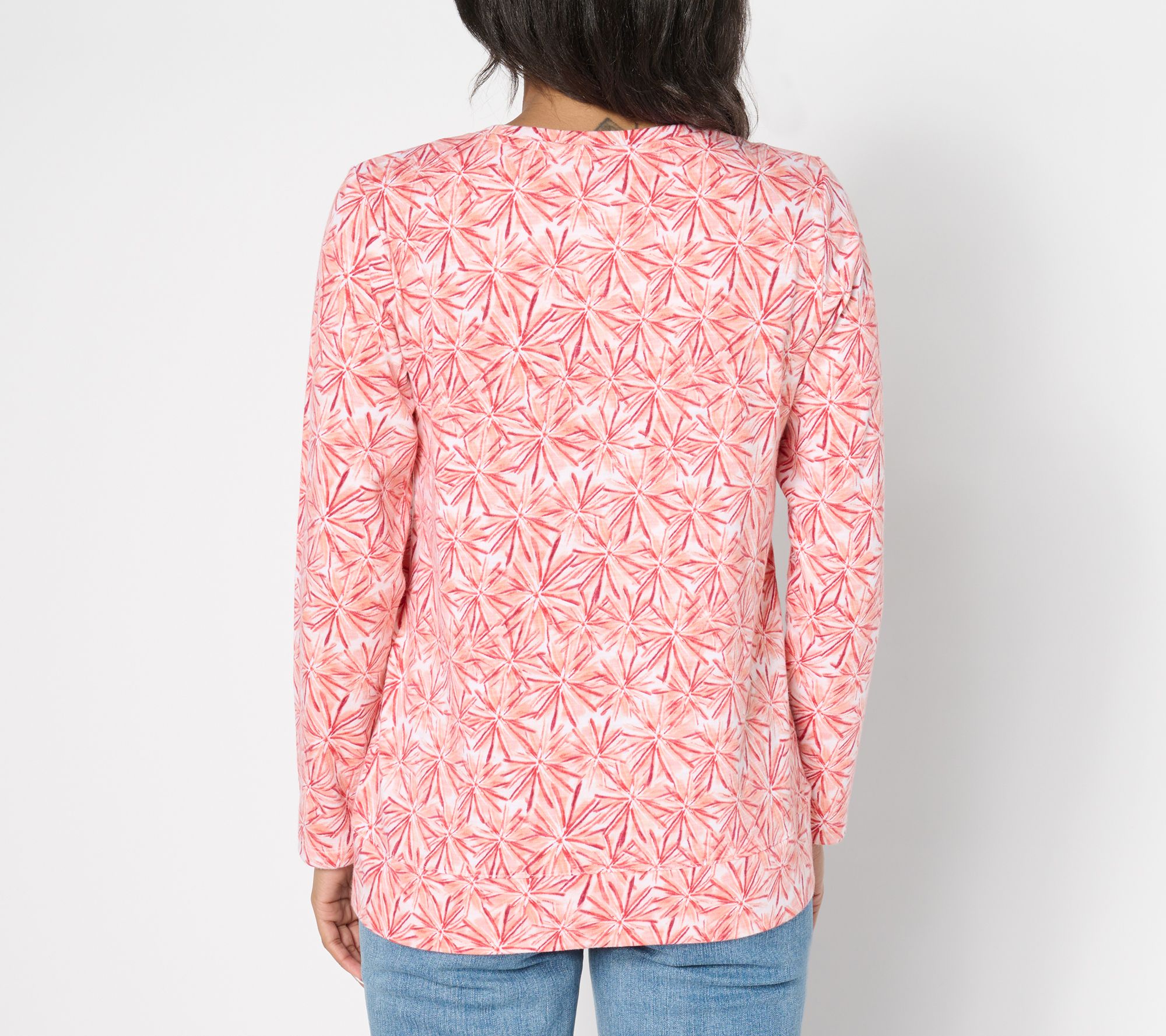 Never taking it off. Designed for activity (hello, morning power walk) and restful moments alike (couch, let's get cozy), this 100% cotton crossover-hem pullover quickly becomes a closet go-to. From Denim & Co.® Fashions.