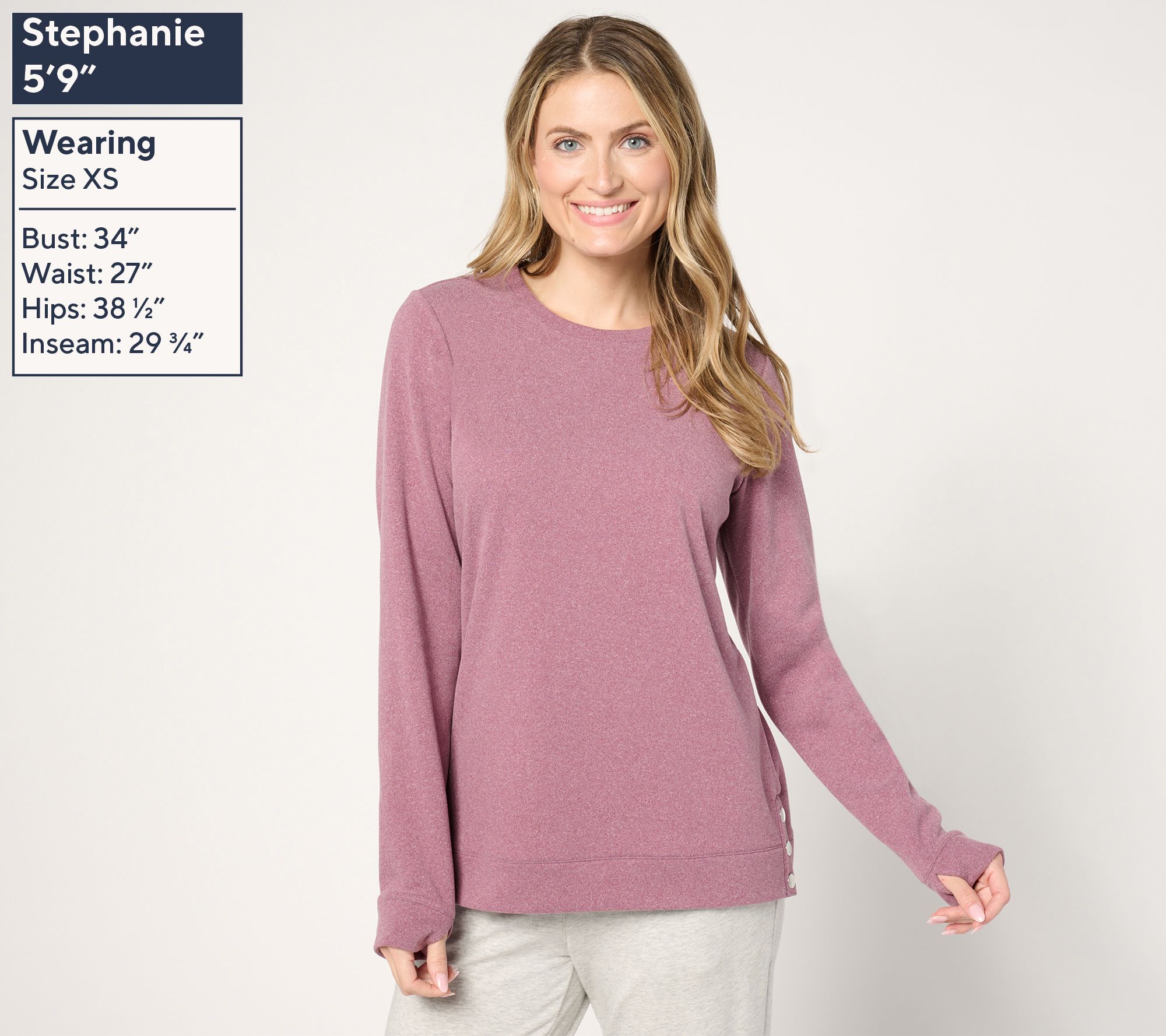 • Features: crew neckline, pullover style, button placket detail at side seams, long sleeves, folded cuffs, bottom band