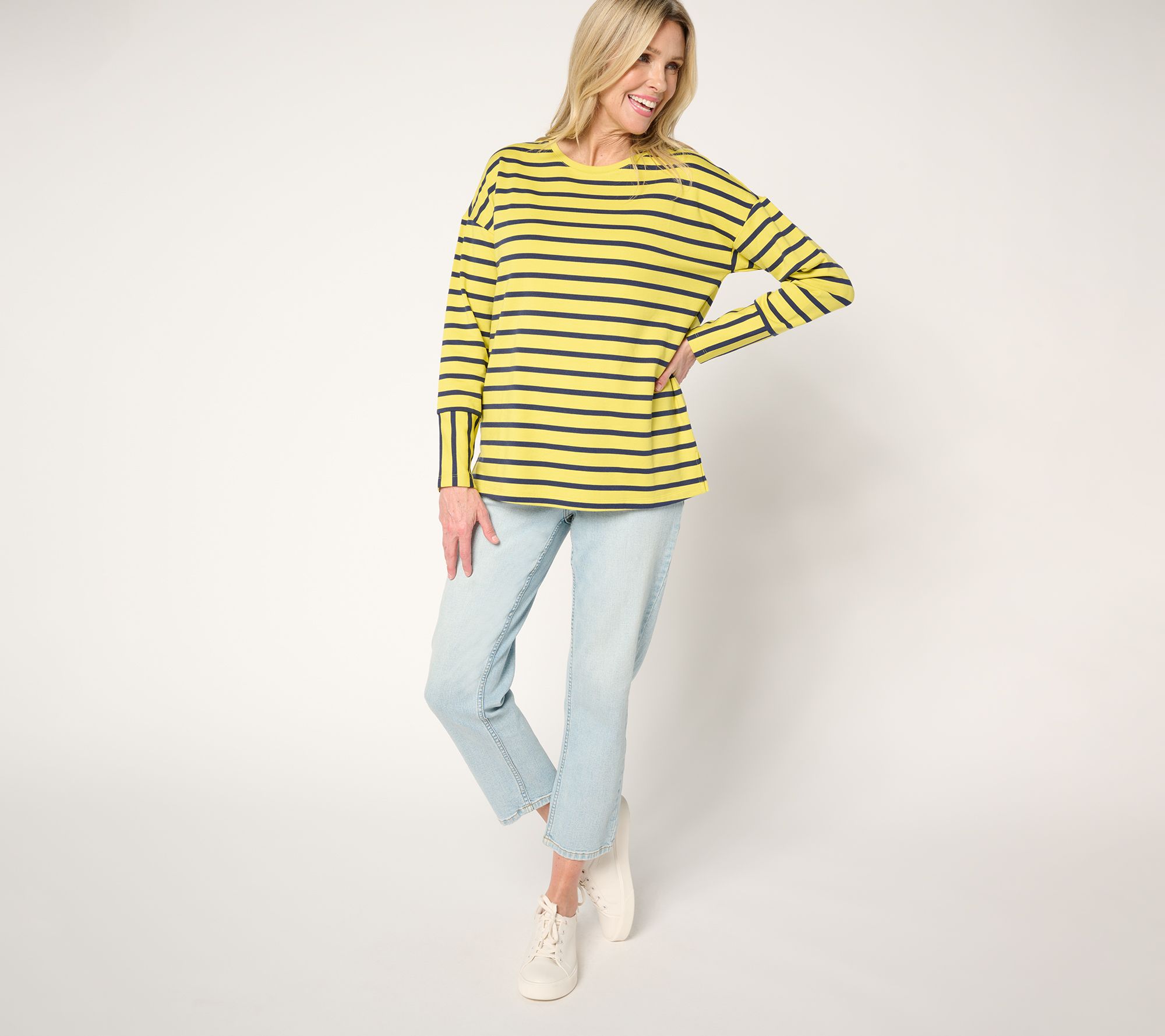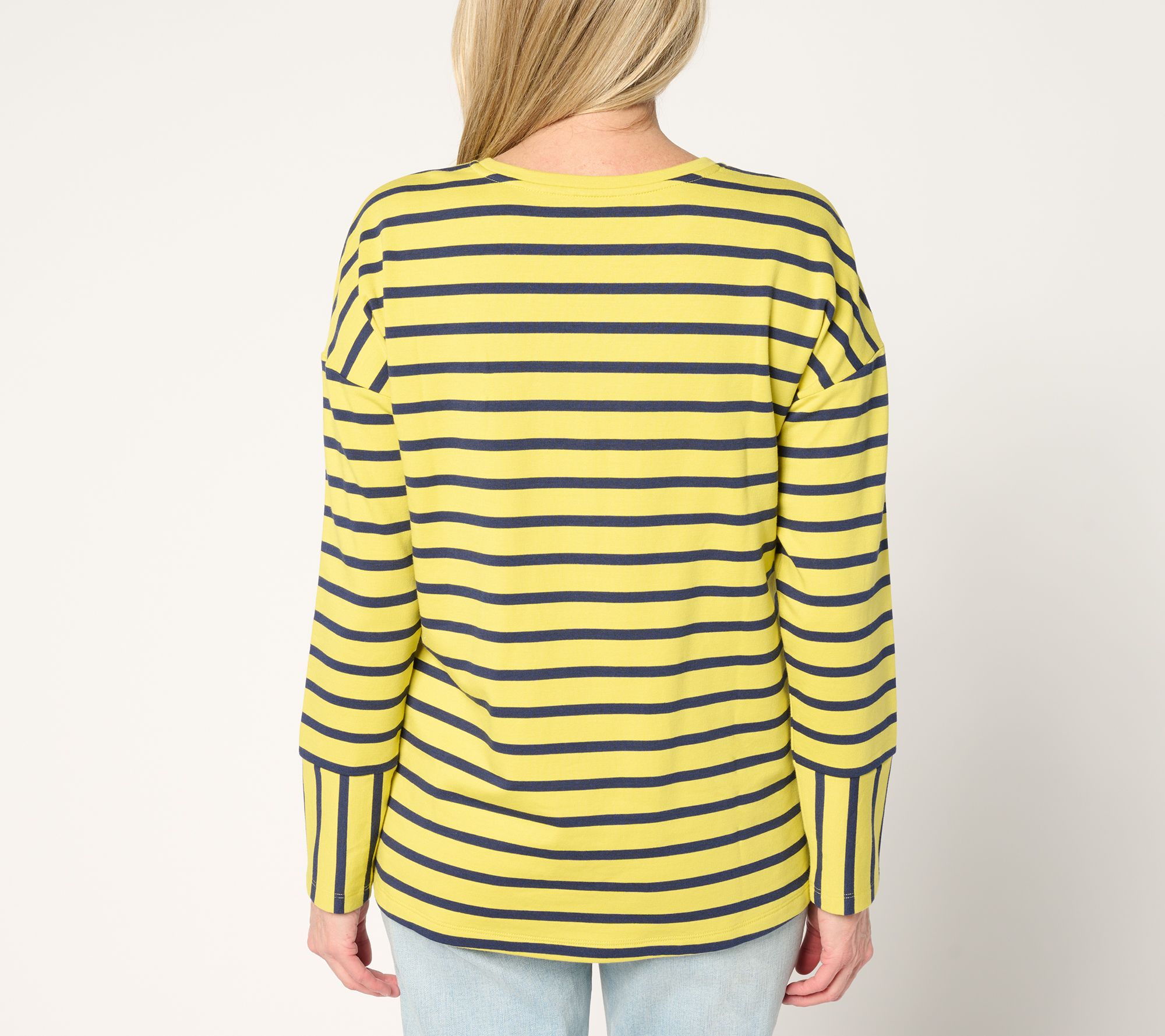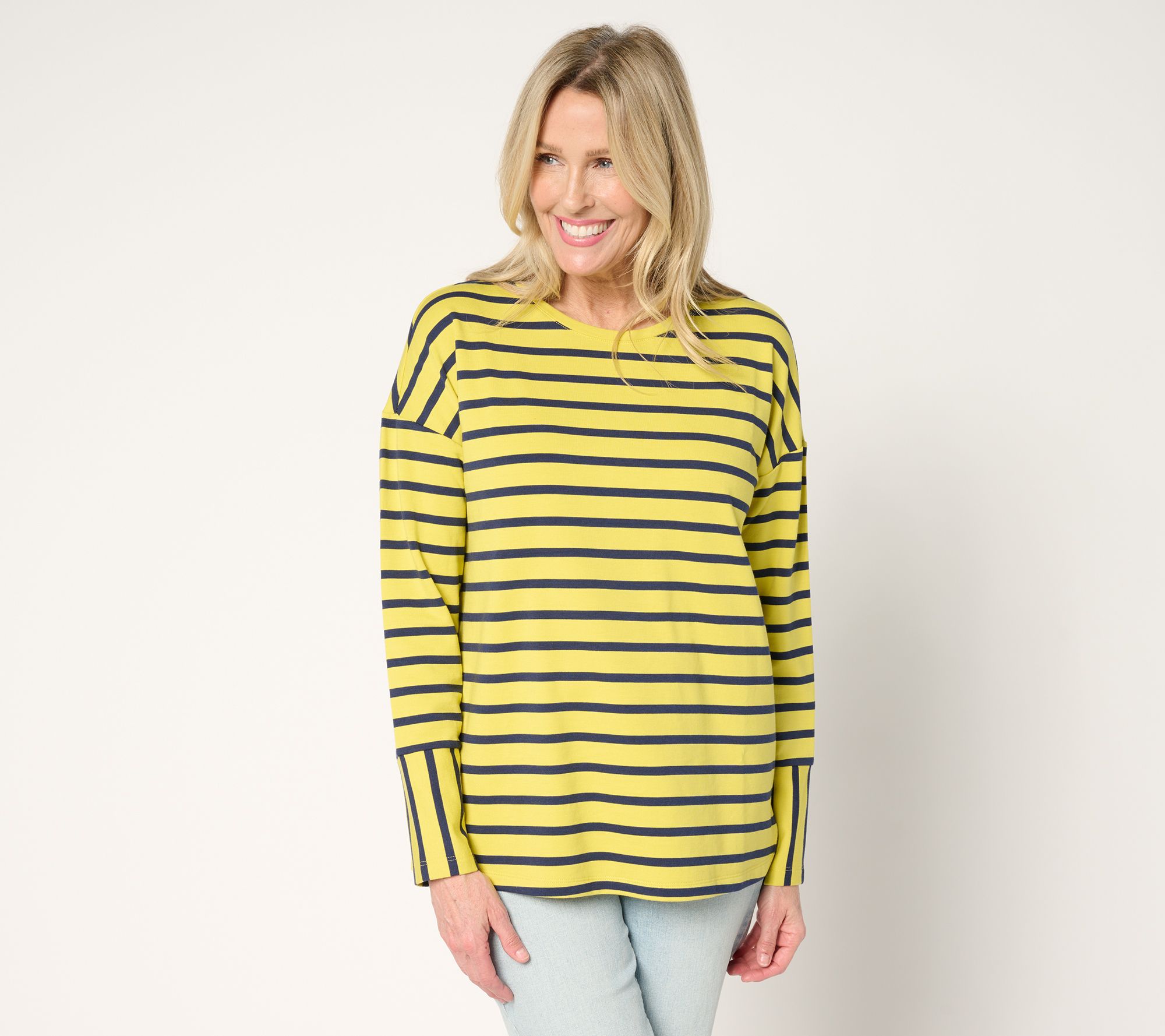 Bring a casual vibe to your wardrobe with this French terry top. The playful mix of stripes adds visual interest, while the drop shoulder ensures a relaxed feel perfect for weekend outings. From Denim & Co.® Fashions.