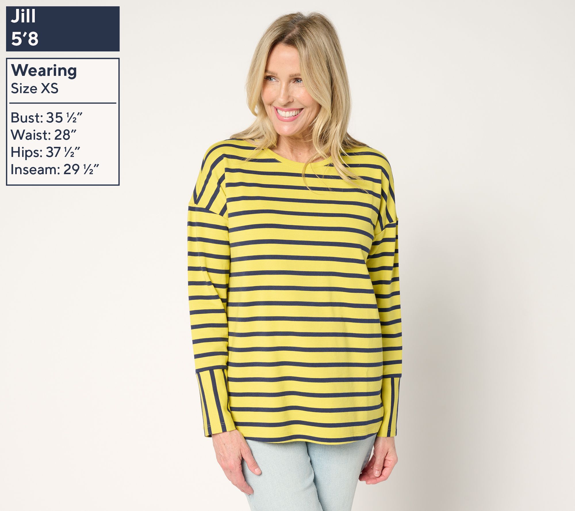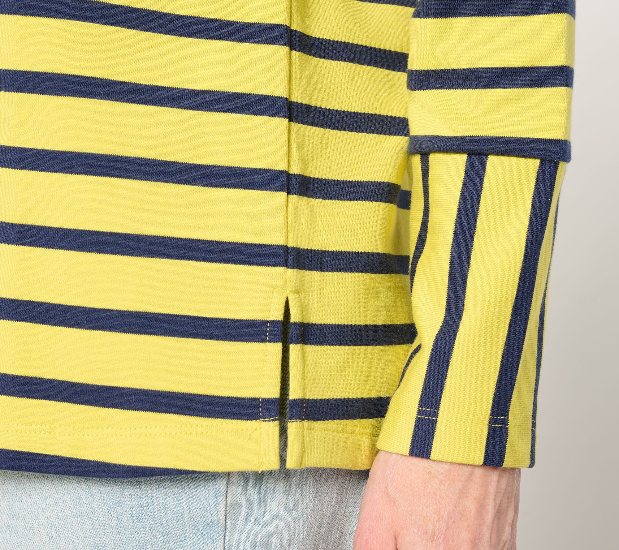 • Features: drop shoulder, yarn-dyed stripes and perpendicular stripes on sleeve, side slits at hem