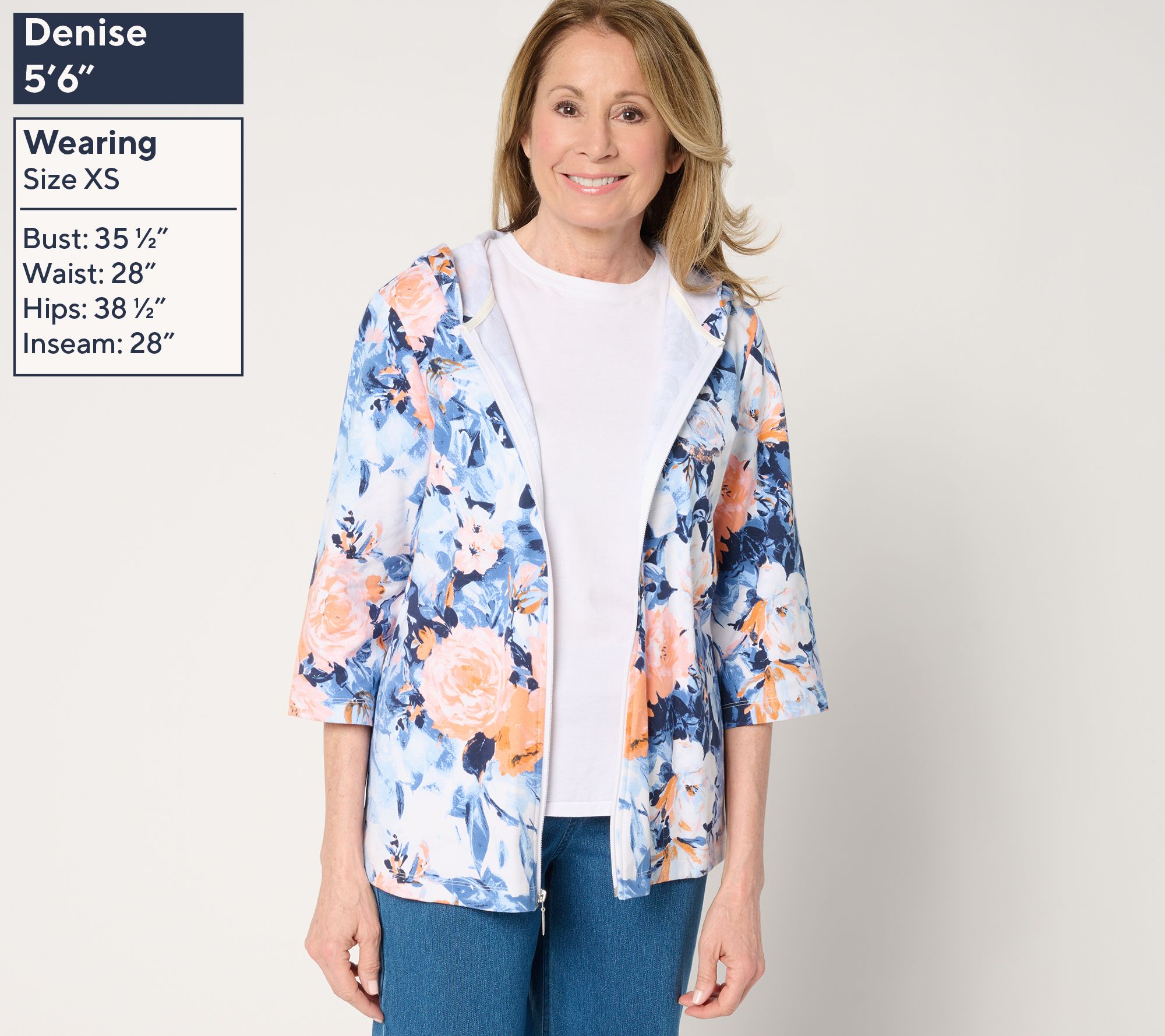 Sunny-season layering takes on a new look with this French terry zip-up from Denim & Co. This activity-minded jacket offers 3/4-length sleeves for a lightweight feel, yet still gives you great coverge and an attached hood for that casual-chic athletic aesthetic. From Denim & Co.® Fashions.