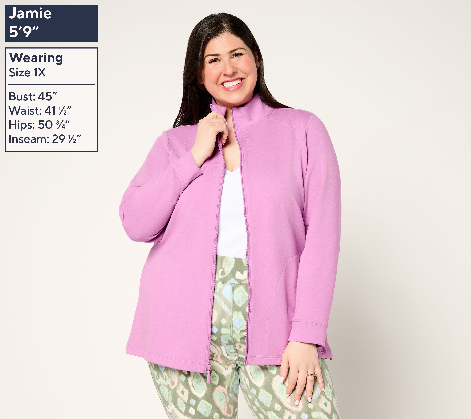 Be as active as you want to be in this zip-front jacket with an extended collar and hem length. Whether that includes taking an early morning walk, chilling on a chaise, or appointments, appointments, and more appointments, soft cotton-stretch French terry delivers distraction-free comfort. From Denim & Co.® Fashions.