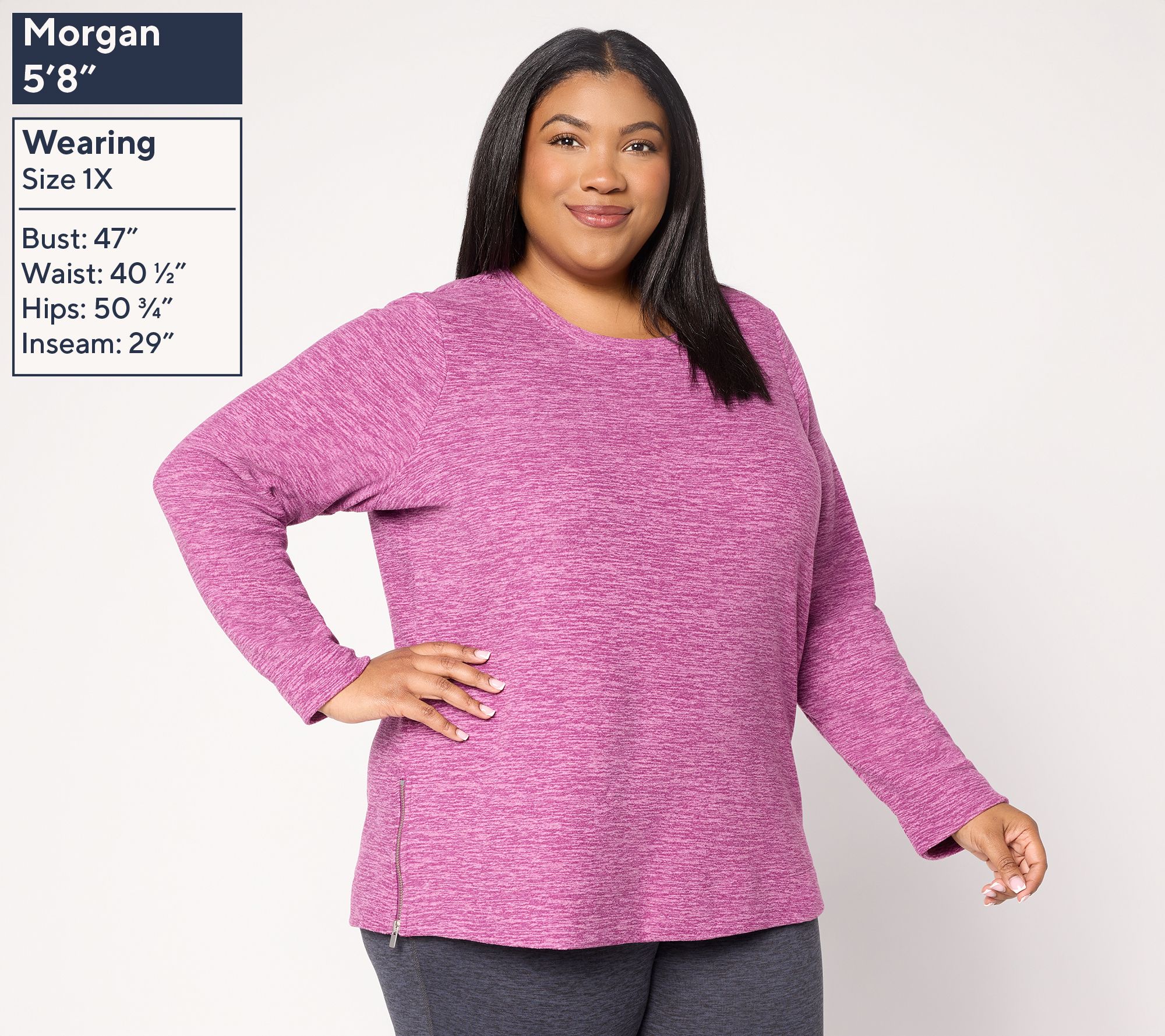 Morning errands, weekend strolls, or more active moments -- a soft heathered fleece top offers cozy warmth and an effortlessly sporty vibe. Side zippers let you customize your hemline fit, whether layered over leggings or styled with your favorite denim. From Denim & Co.® Fashions.