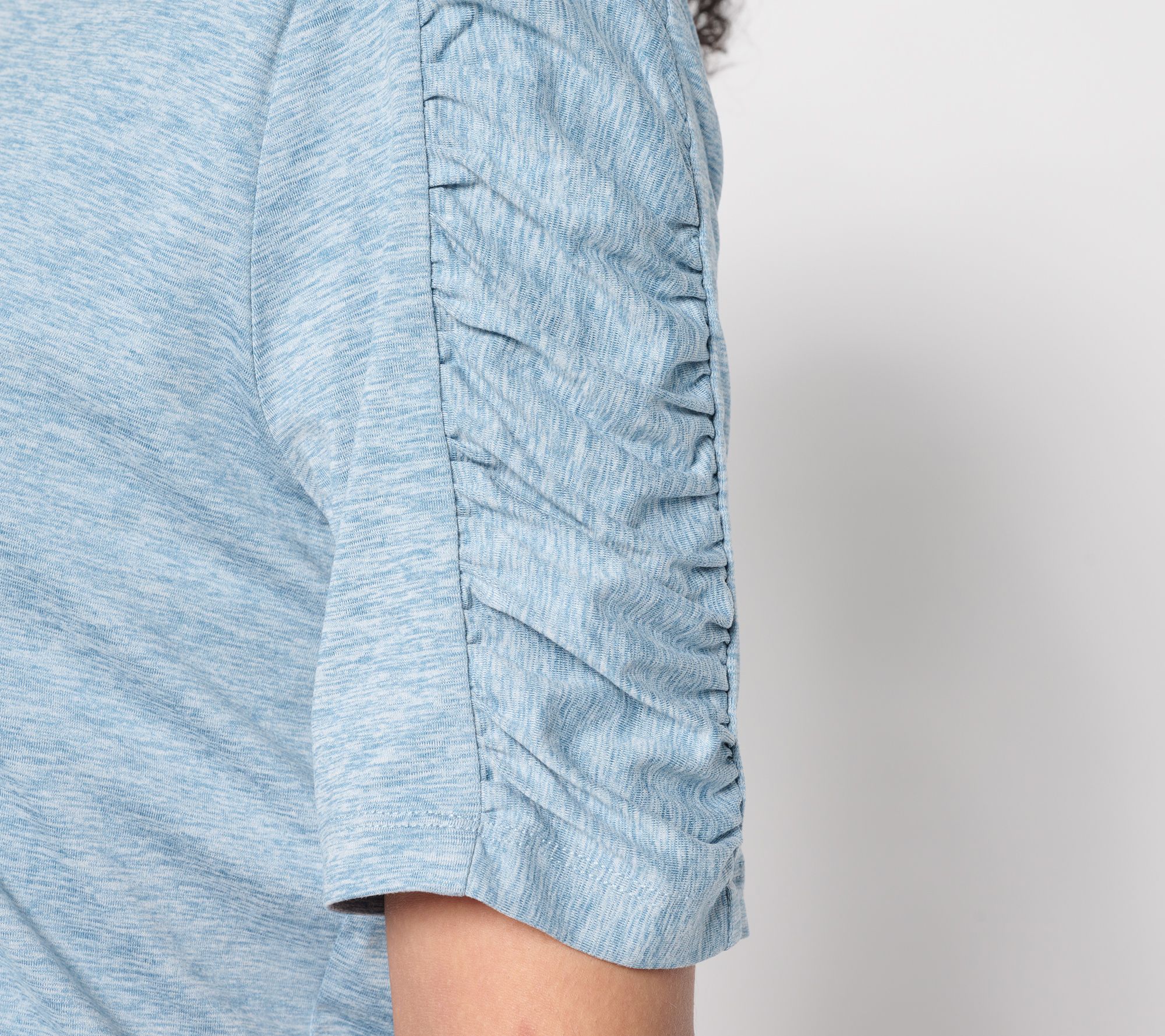 You're going to want to live in this cool-to-the-touch jersey tunic. With its playful sleeve ruching detail and curved hem, it’s perfect for keeping your style fresh and fun. Wear it with your favorite leggings or jeans for an effortlessly chic look. From Denim & Co.® Fashions.