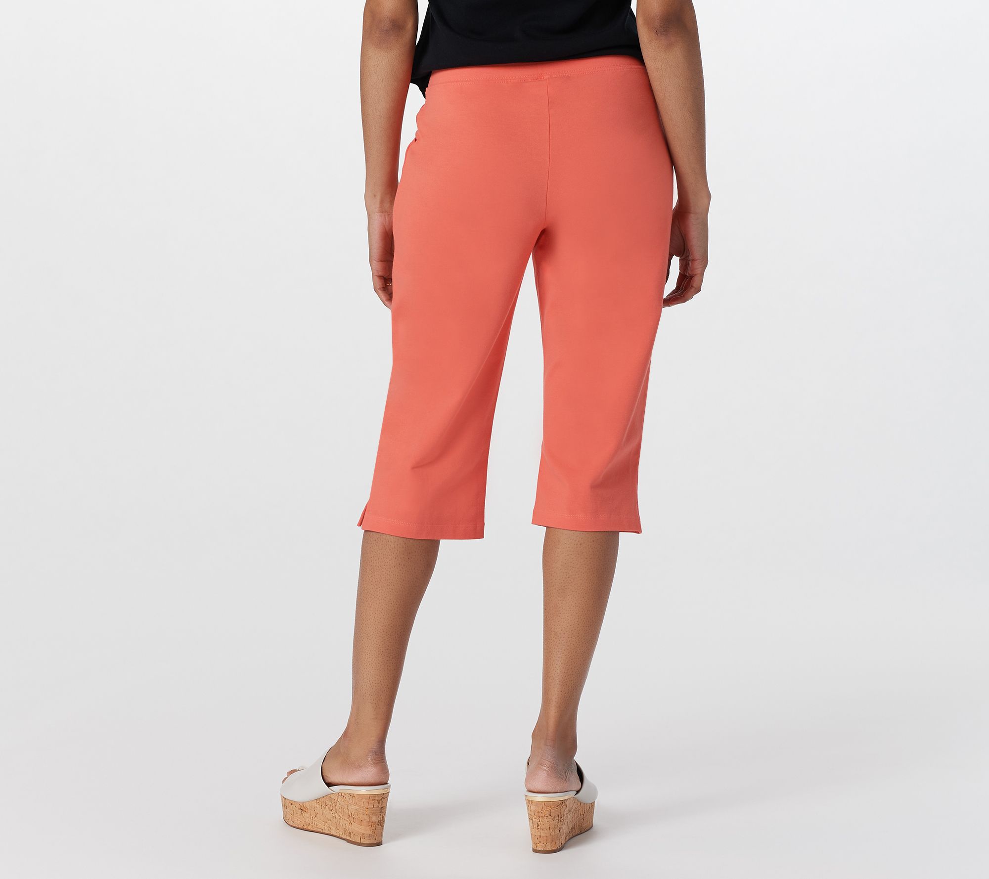 • Features: skimmer length, pull-on style, self-folded flat elastic waistband, slash front pockets, center front leg seaming detail, side slits at bottom hem