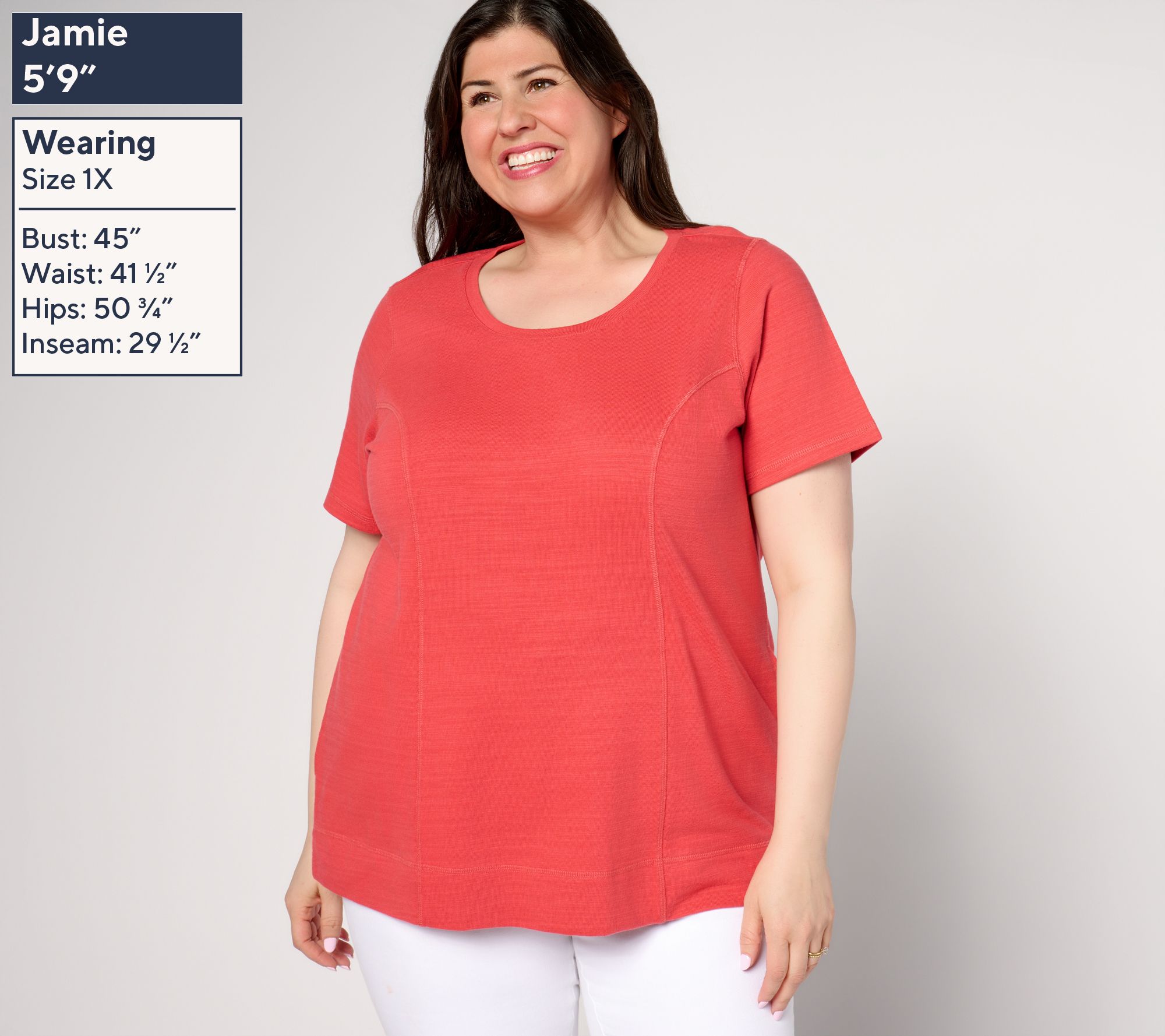 • Features: textured, scoop neckline, short sleeves, princess seams, side seam pockets, wide hem with side slits