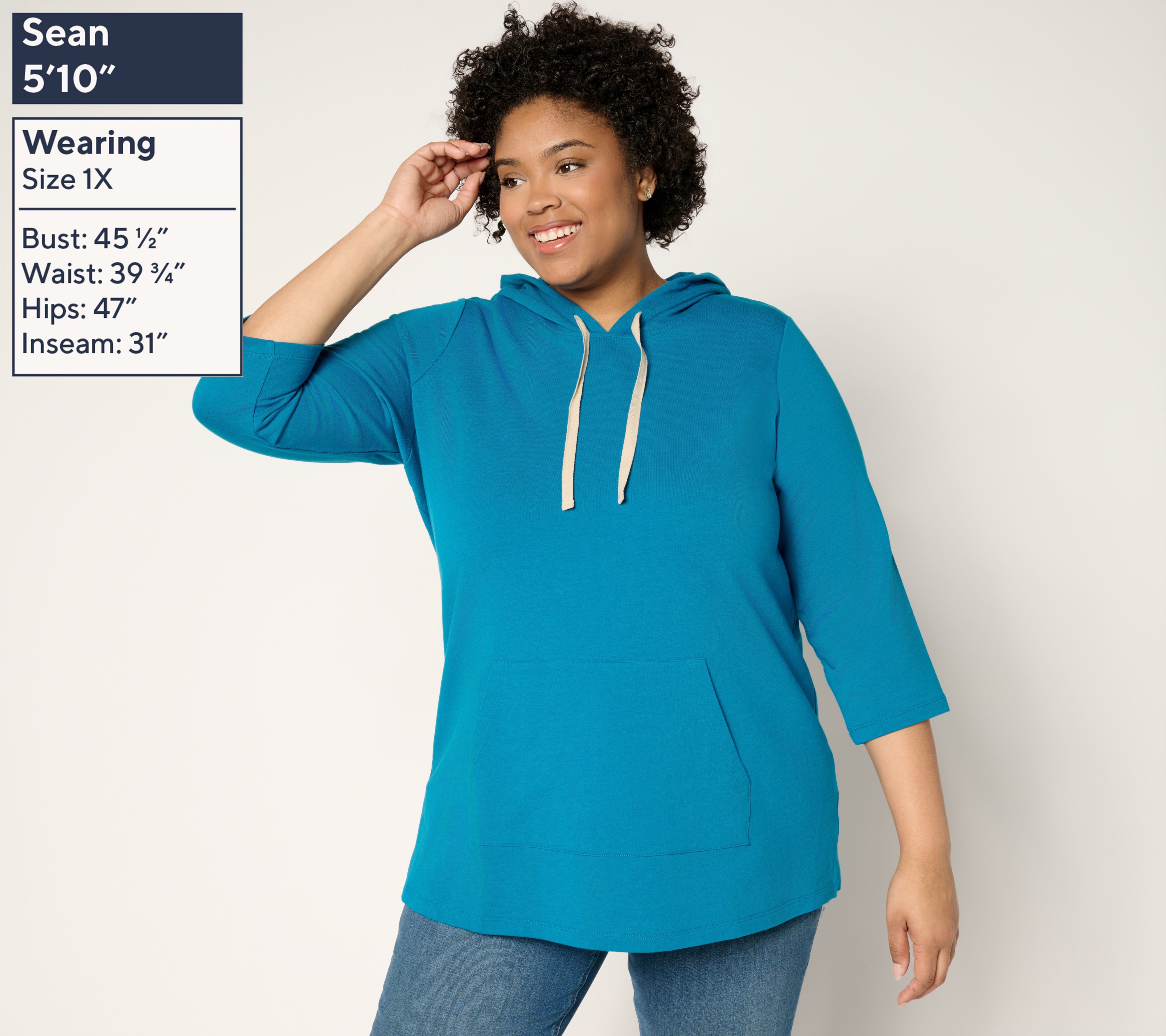 Lend your casual wardrobe a ready-for-anything vibe with this tunic pullover in soft French terry. The hooded design, featuring a phone-accommodating kangaroo pocket and a comfortable length, is the ideal choice for a relaxed yet chic look (even when you're chasing pets or kids). From Denim & Co.® Fashions.