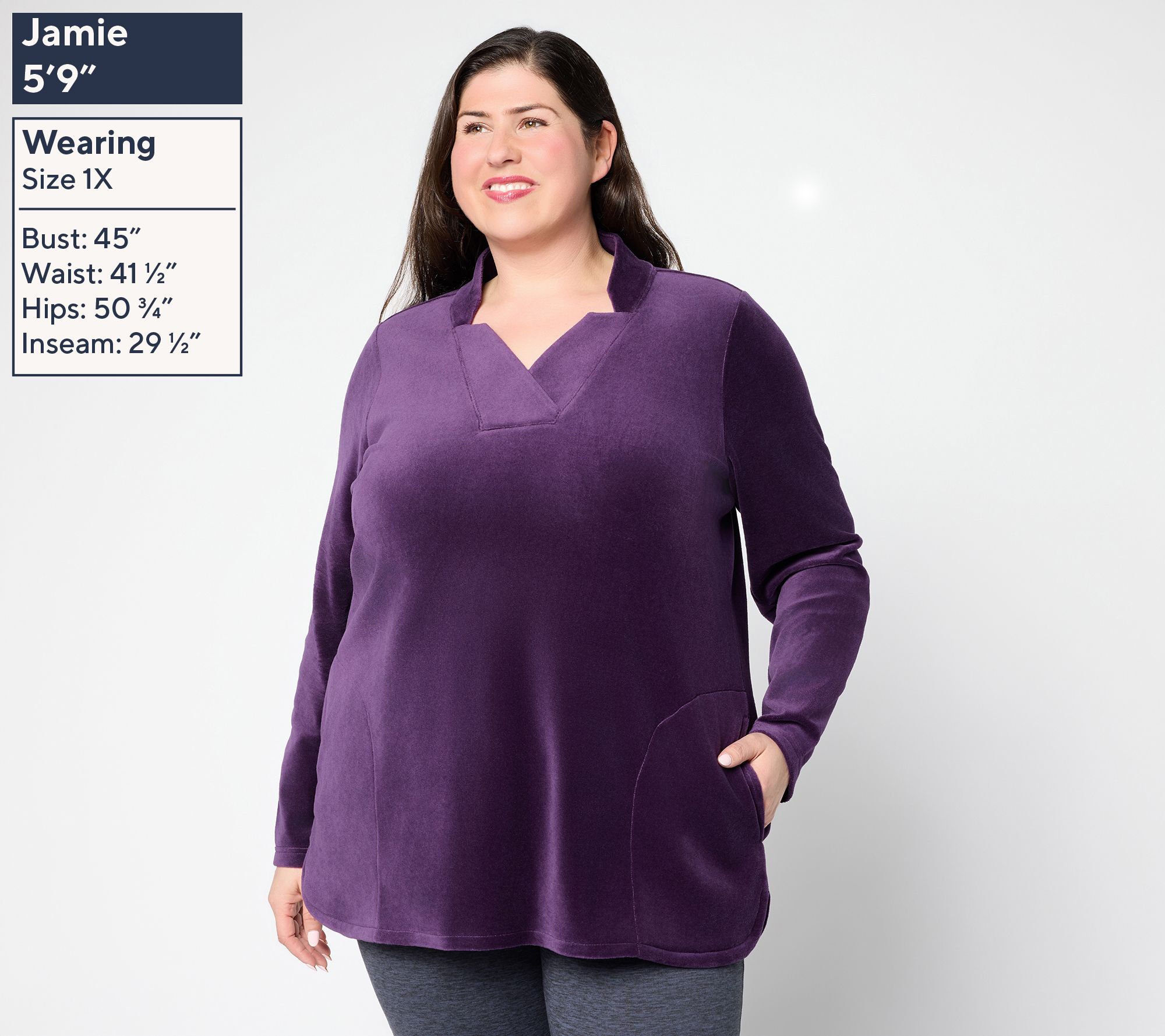 Soft velour knit and a classic notch collar come together to create a tunic that works effortlessly for both casual errands and cozy evenings at home. Side slits at the curved hem and stitched-through front pockets lend functional flair while offering versatility from weekday wear to weekend relaxation. From Denim & Co.® Fashion.