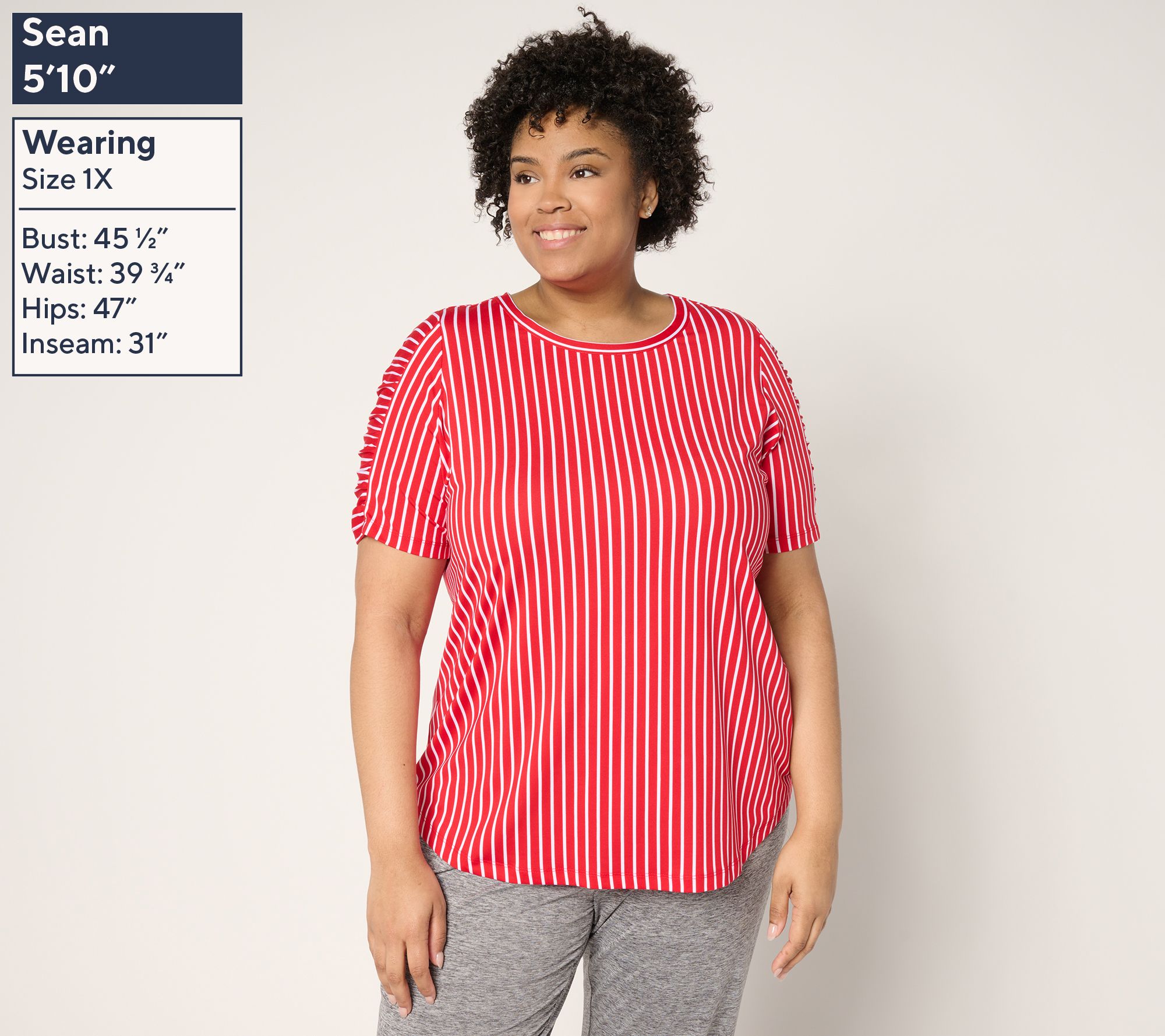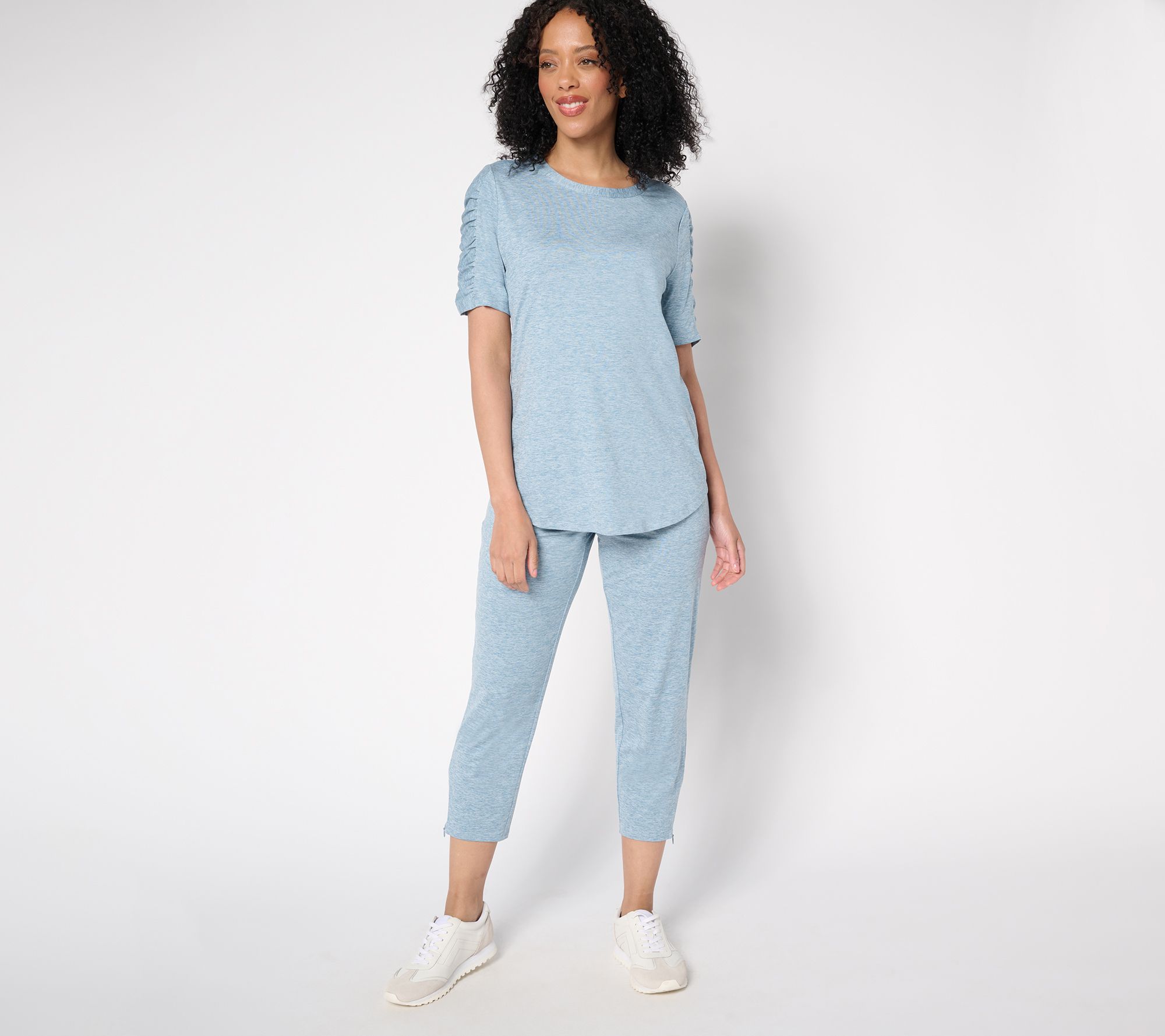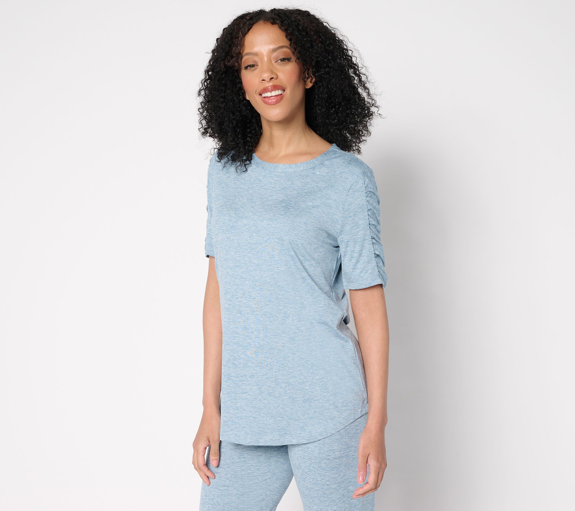 You're going to want to live in this cool-to-the-touch jersey tunic. With its playful sleeve ruching detail and curved hem, it’s perfect for keeping your style fresh and fun. Wear it with your favorite leggings or jeans for an effortlessly chic look. From Denim & Co.® Fashions.