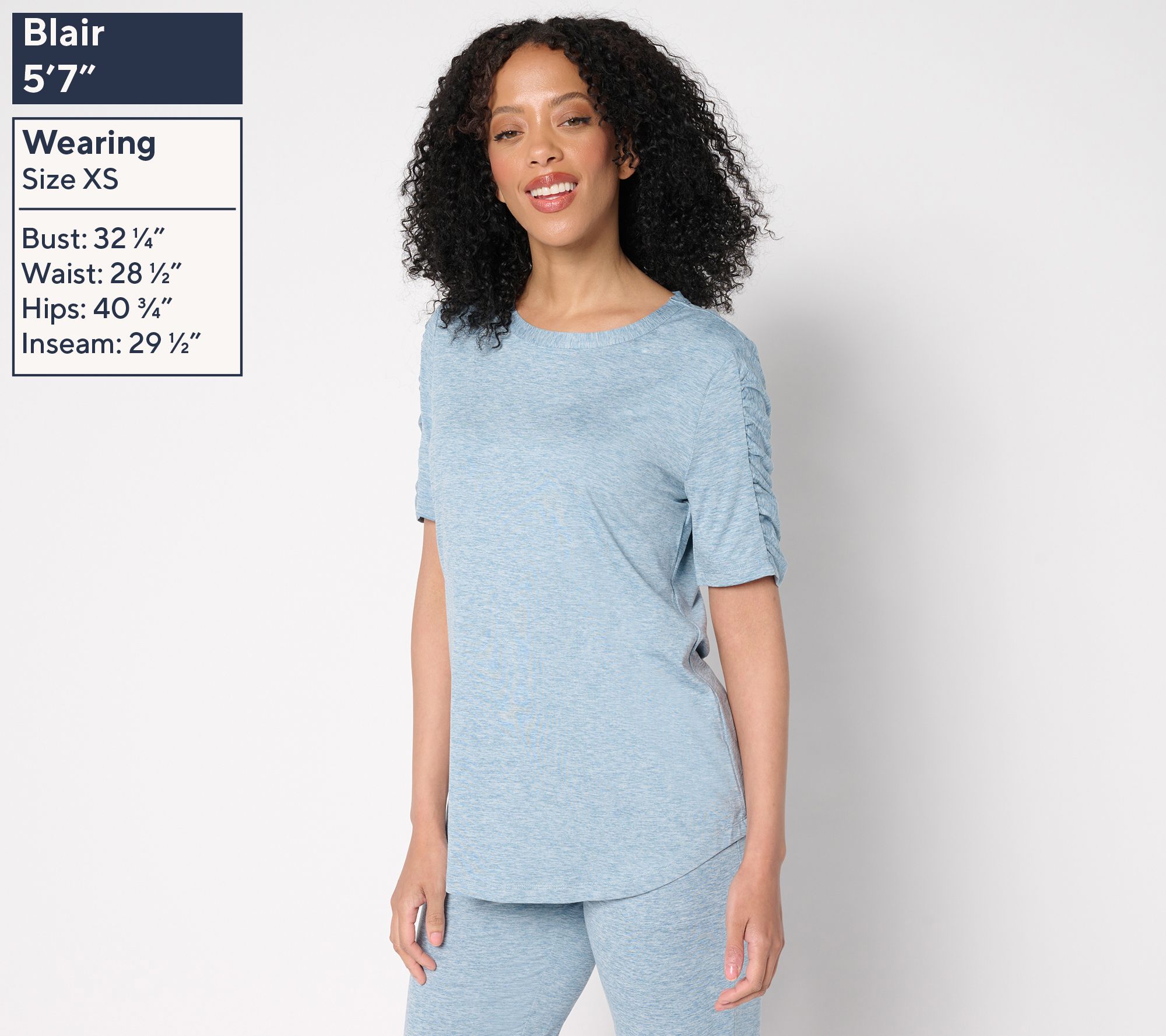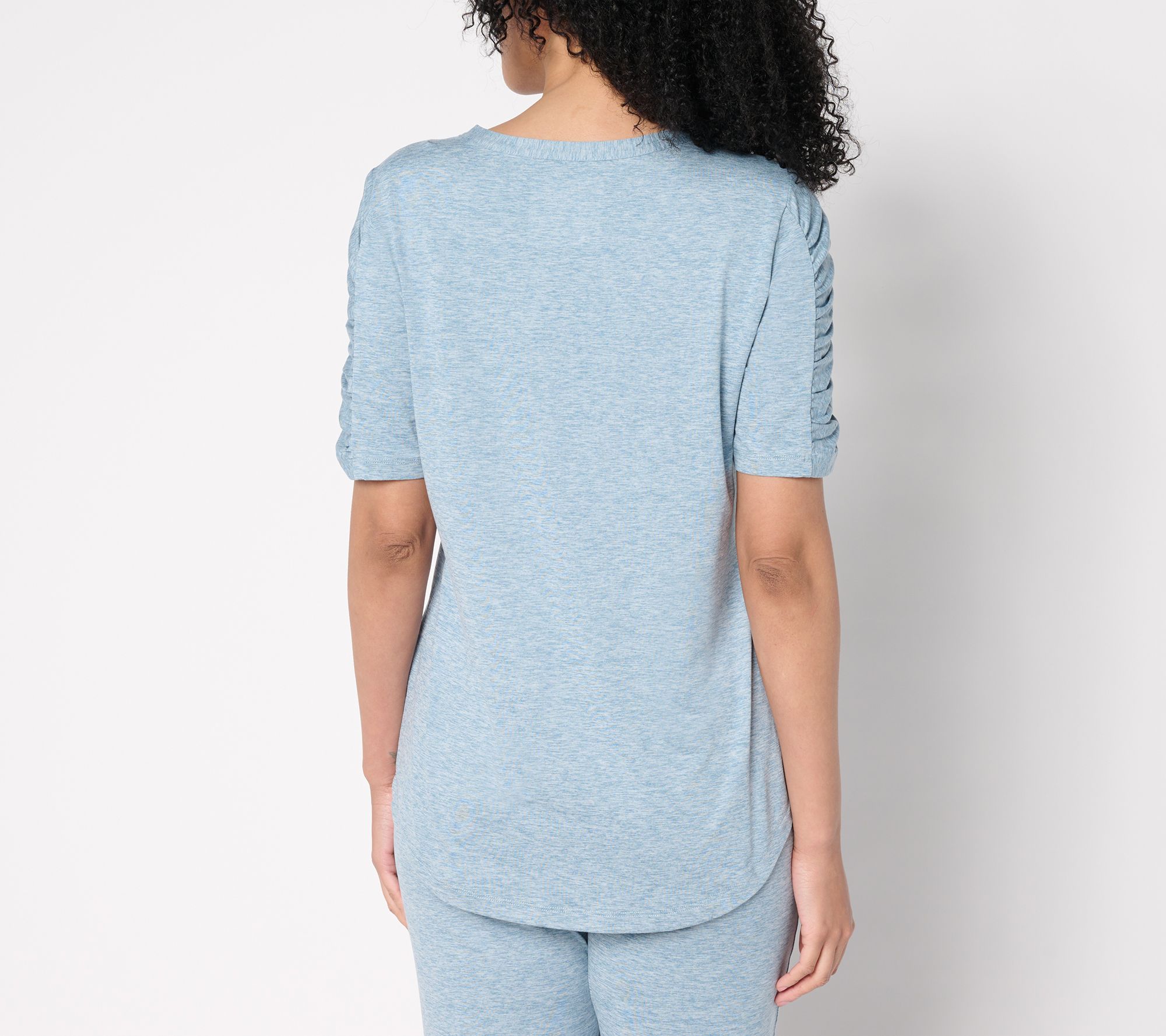 • Features: top-applied neckband, ruching detail inset at center of sleeves, curved hem detail