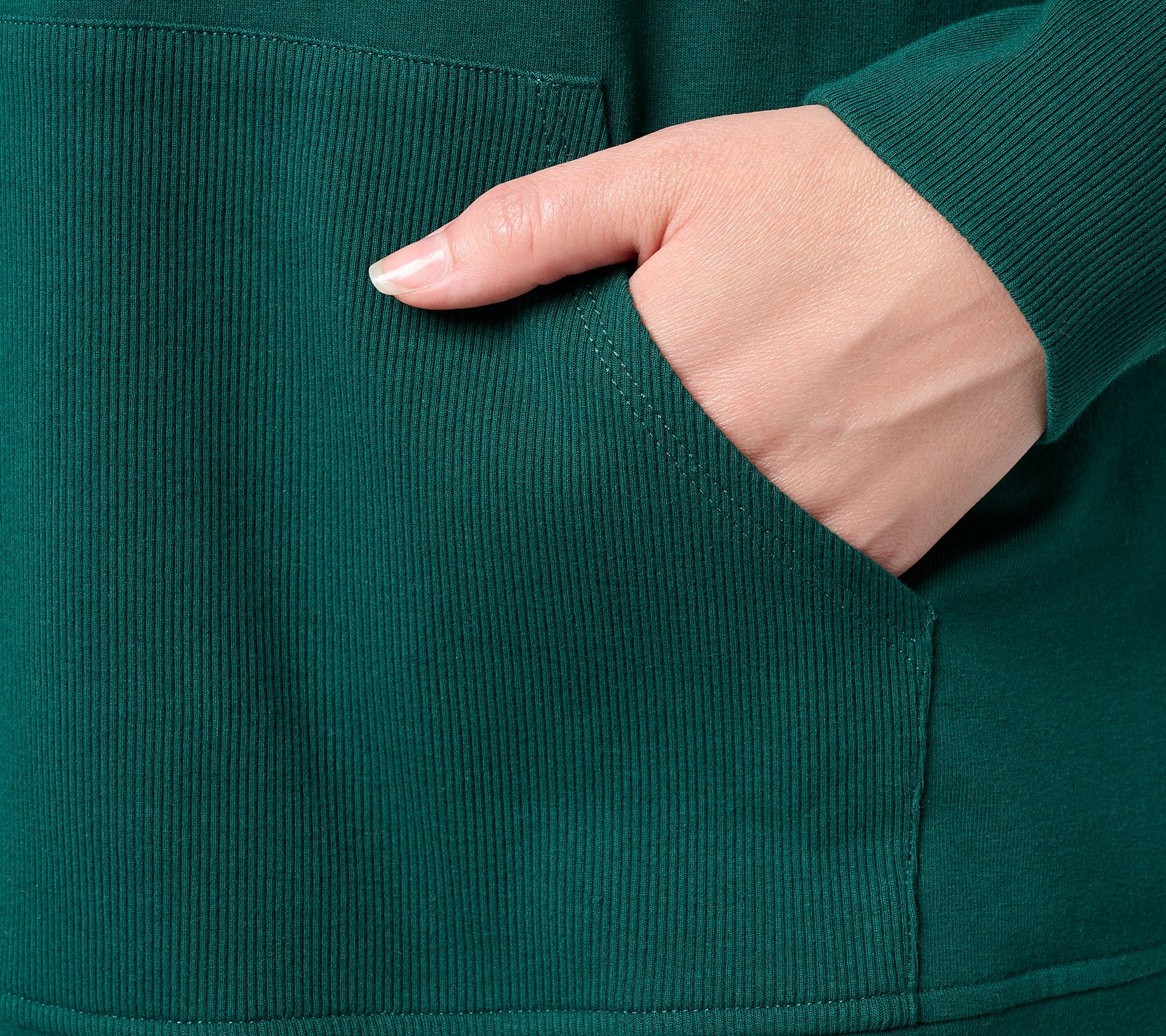 • Features: V-neckline, collar with pleats, long sleeves with ribbed cuff, kangaroo pocket, bottom band