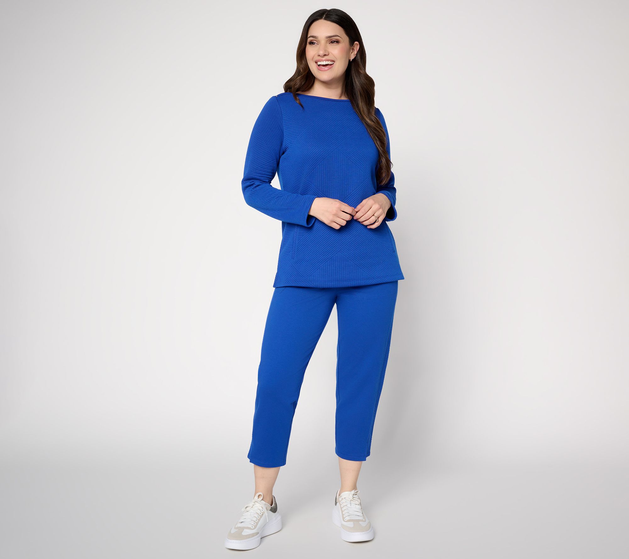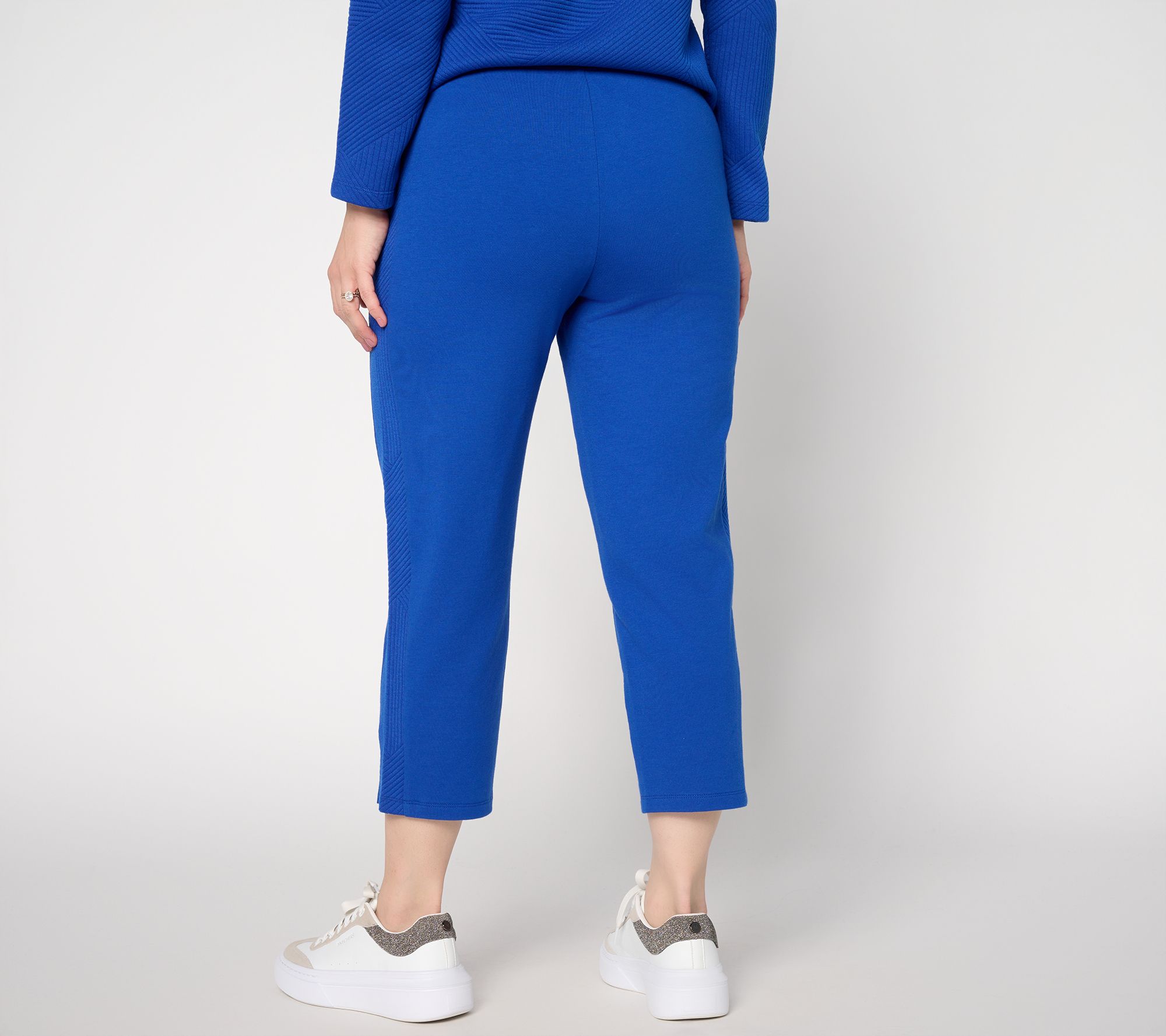 Morning walks or afternoons on the go feel effortless in these semi-fitted jacquard crop pants. The soft knit blend stretches comfortably as you move, while slash pockets keep essentials handy, and side slits at the straight-leg openings add a playful twist. From Denim & Co.® Fashions.