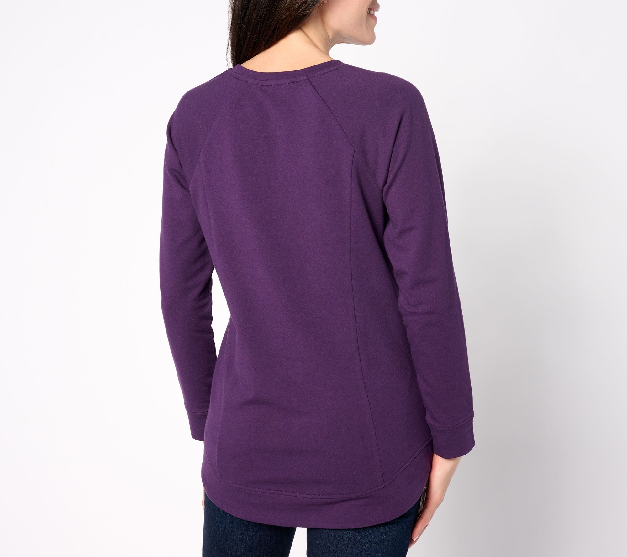 • Features: round neck, twill tape over back neck seam, raglan armholes, long sleeves, front and back princess seams, on-seam pockets, hi-low shirttail hem