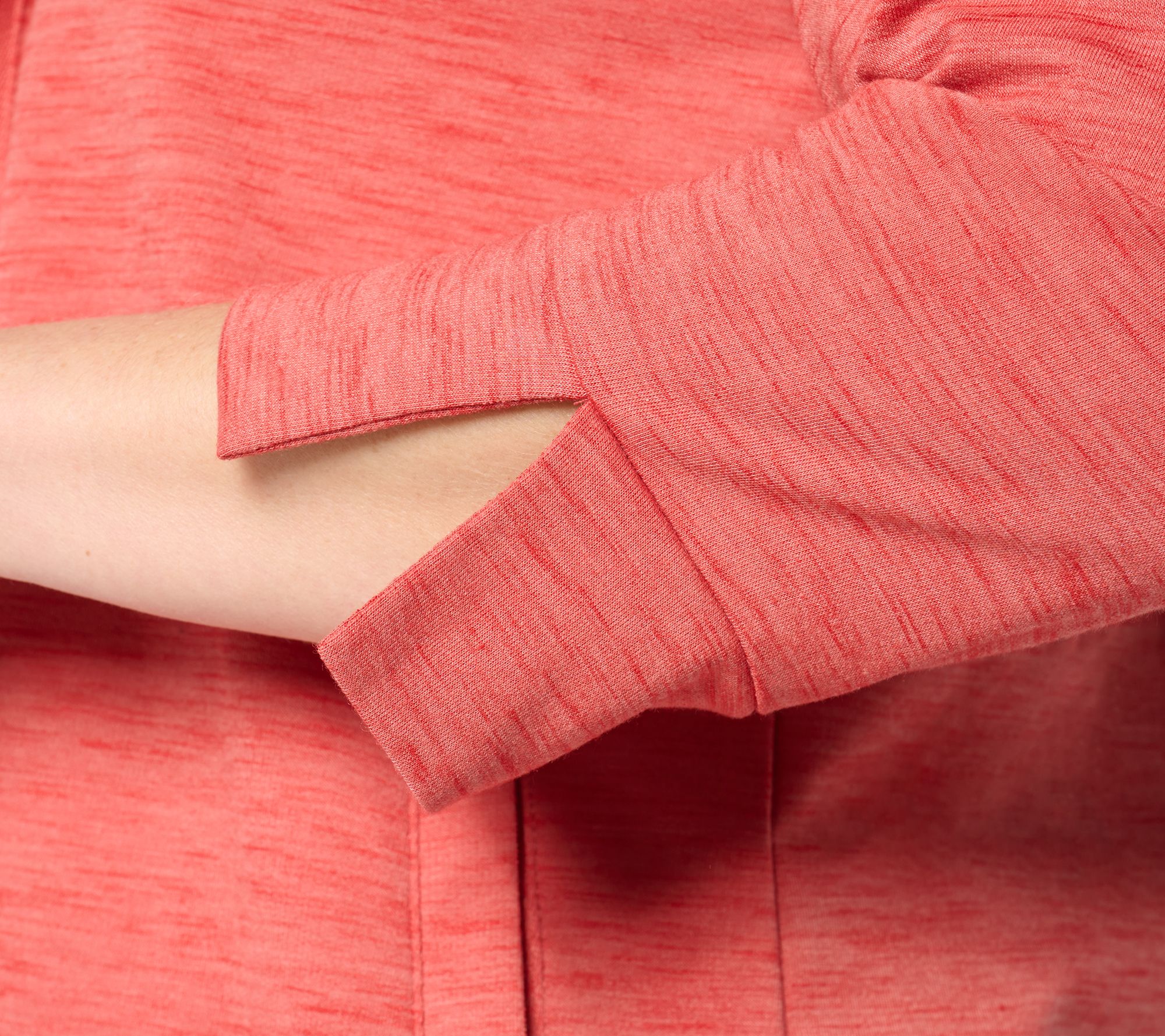 • Features: collared neck, 3/4-length sleeves with folded cuff, angled front welt pockets, curved bottom hem