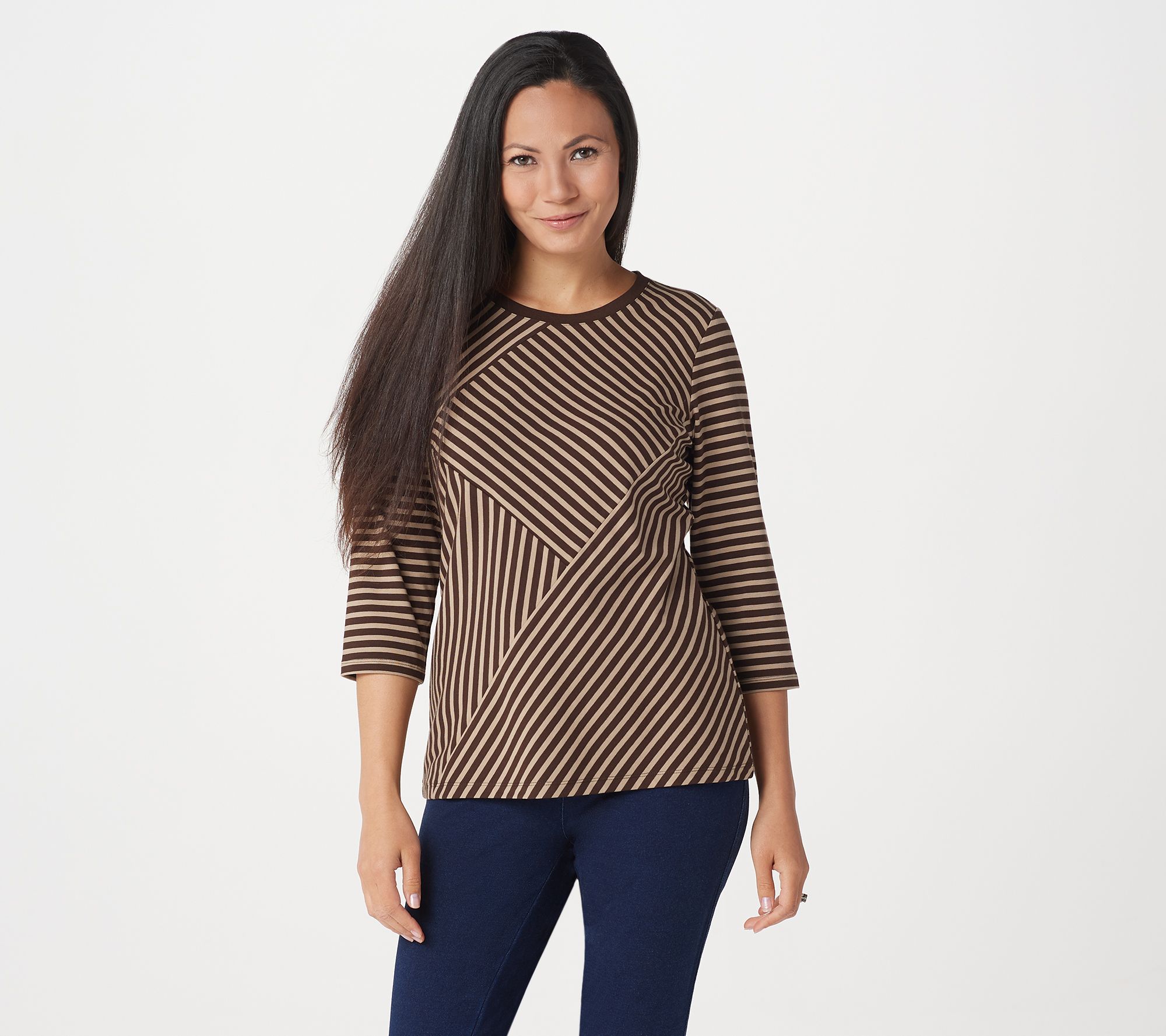 • Top Features: striped, 3/4-length sleeves, round neck, seam detailed front