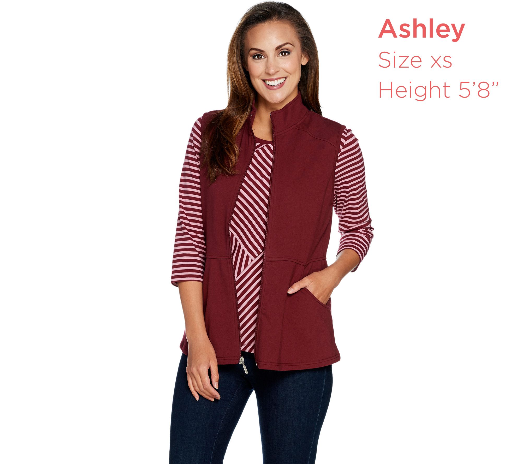 "As Is" Denim & Co. Active Striped 3/4 Slv Top w/Zip Front Peplum Vest Set