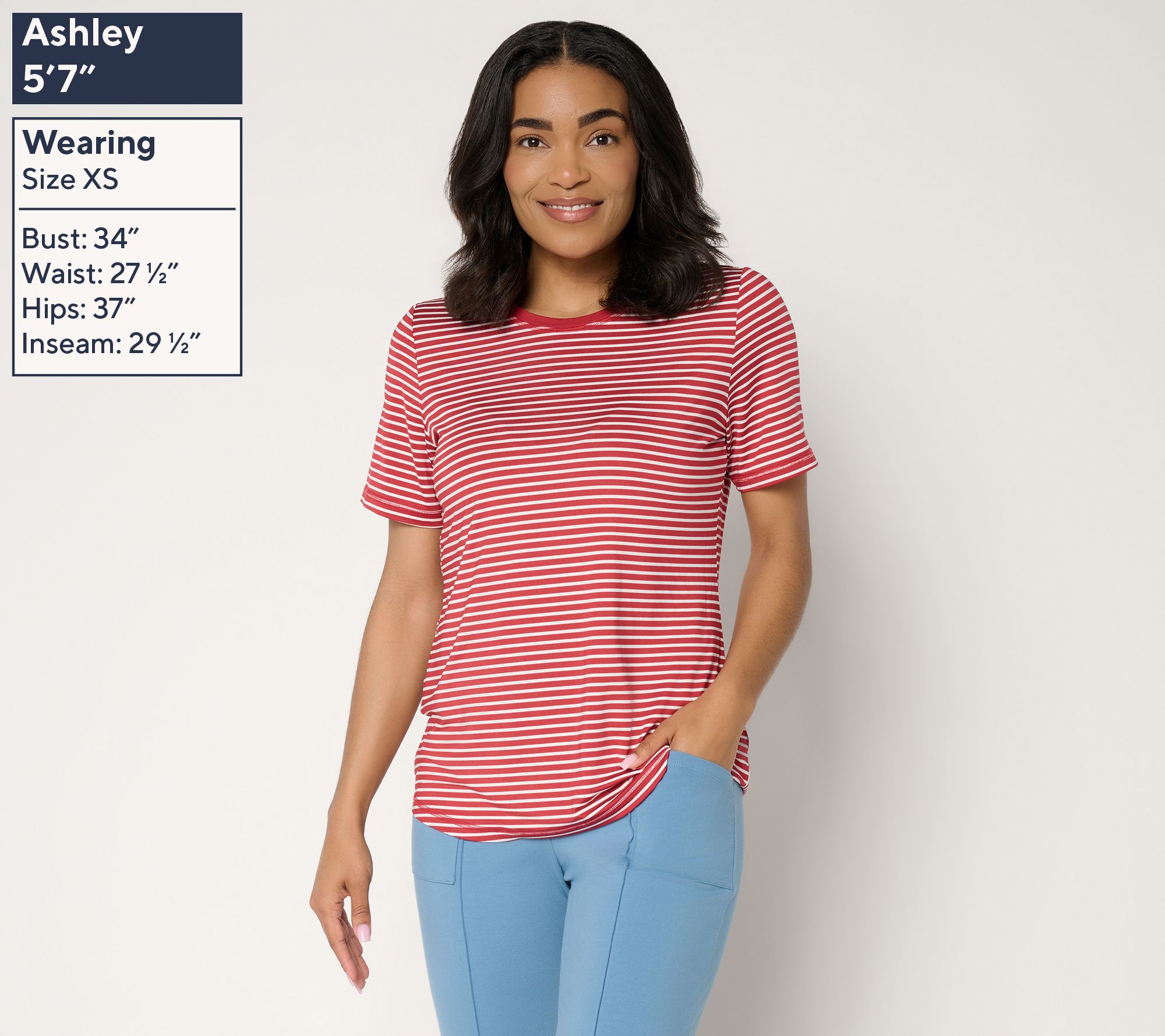 • Features: short sleeves, round neckline, exposed stitch details on, back seaming and curved bottom hem with exposed stitching, striped design