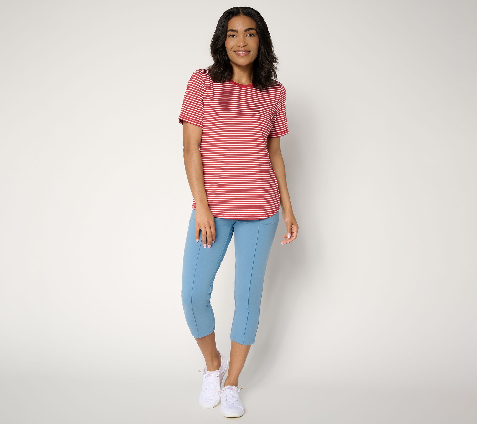 Casual comfort that captures the eye, this striped top makes an effortless mate for denim shorts, khaki pants, or a twill skirt. Horizontal stripes give the versatile style a timeless appeal, while exposed stitch details add a freshly crafted feel. From Denim & Co.® Fashions.