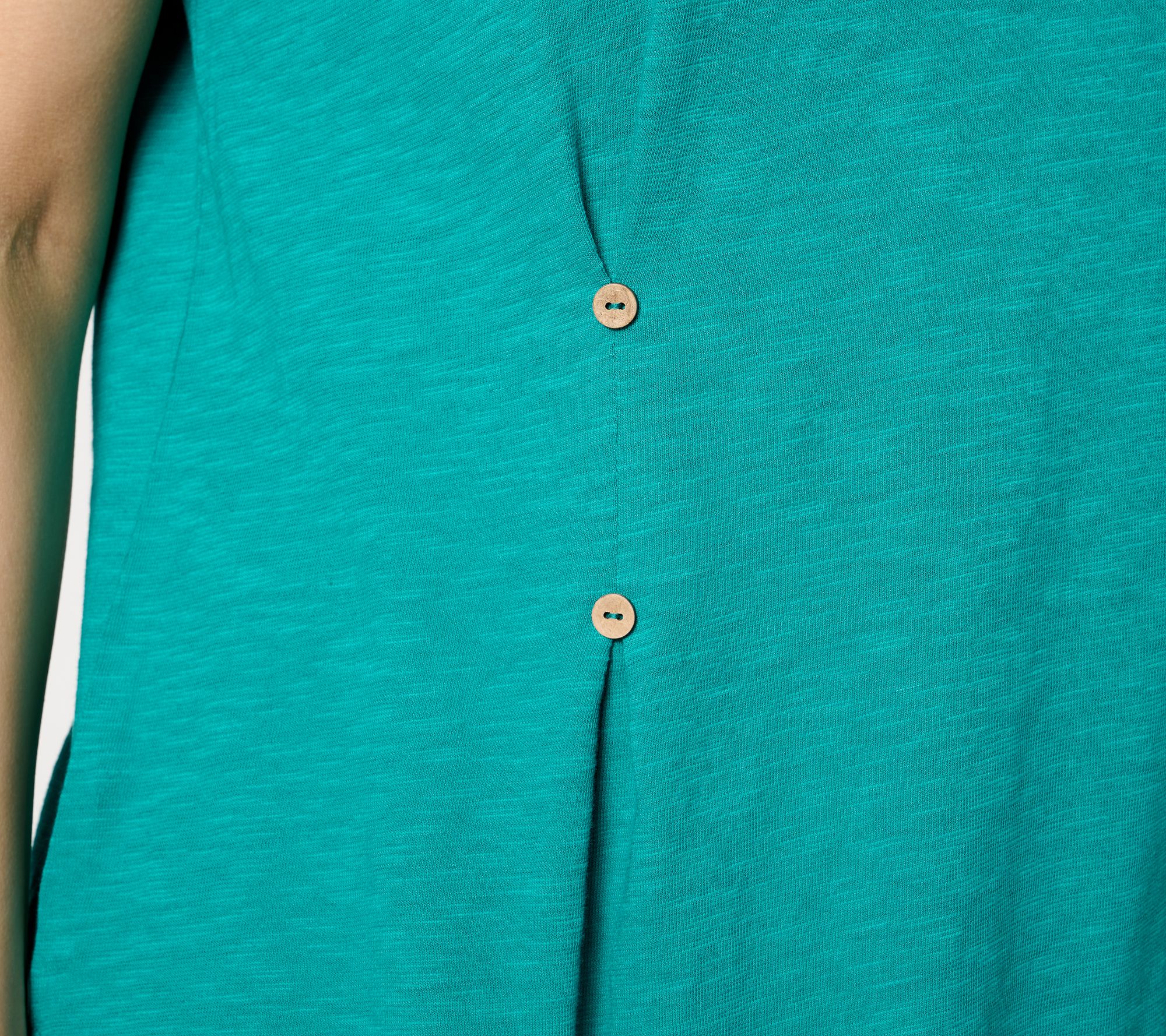• Features: round neckline, short dolman sleeves, button and pleat at wearer's right front body, straight bottom hem, side slits