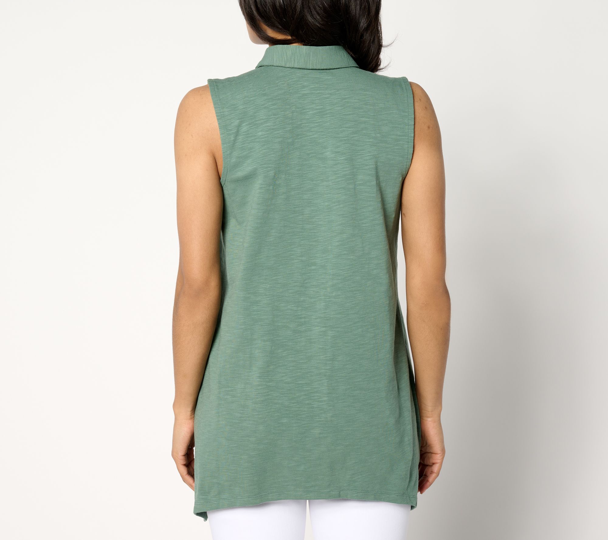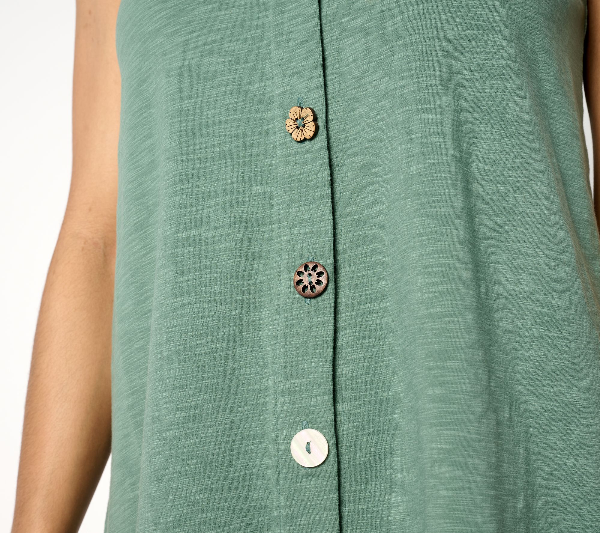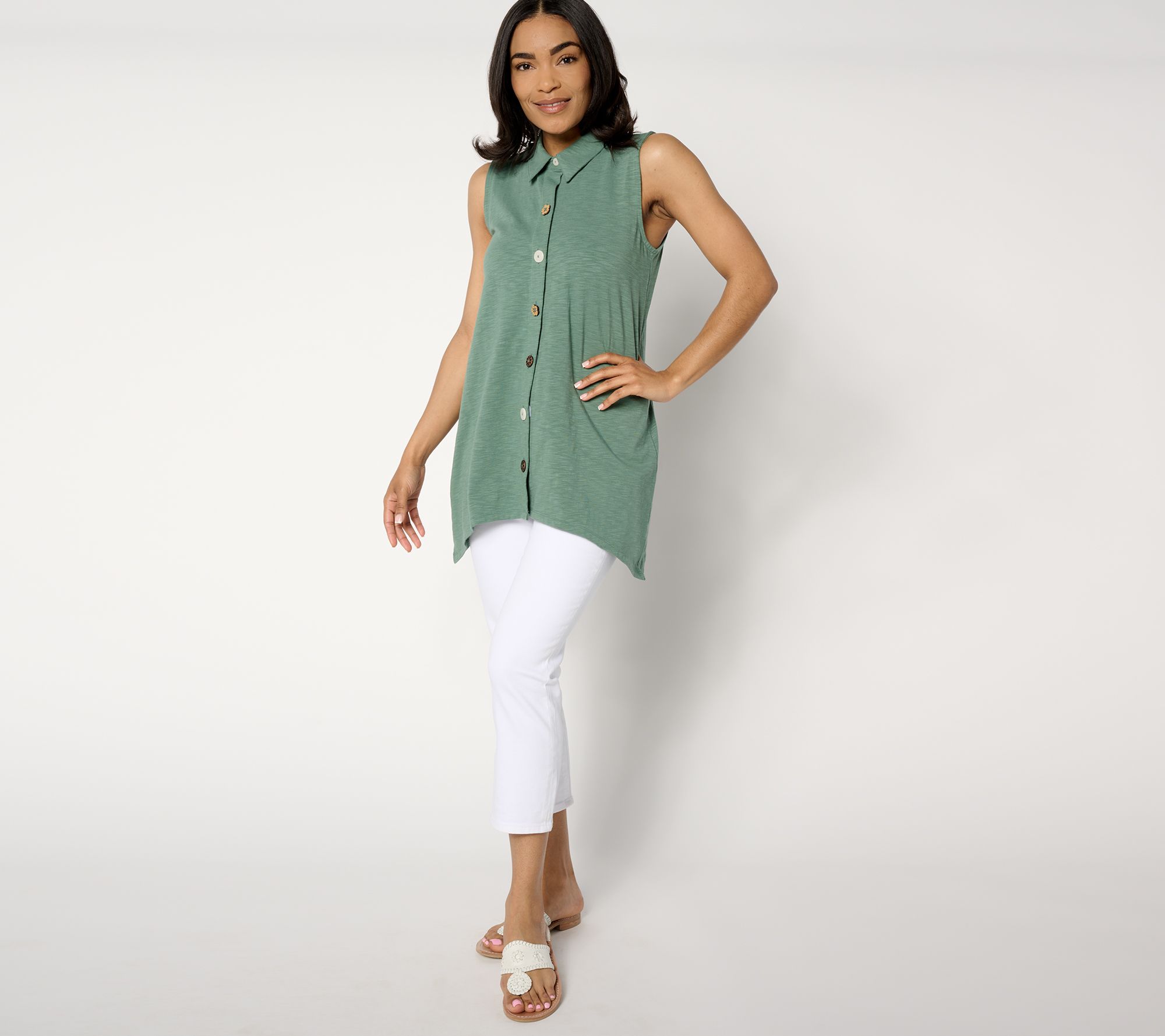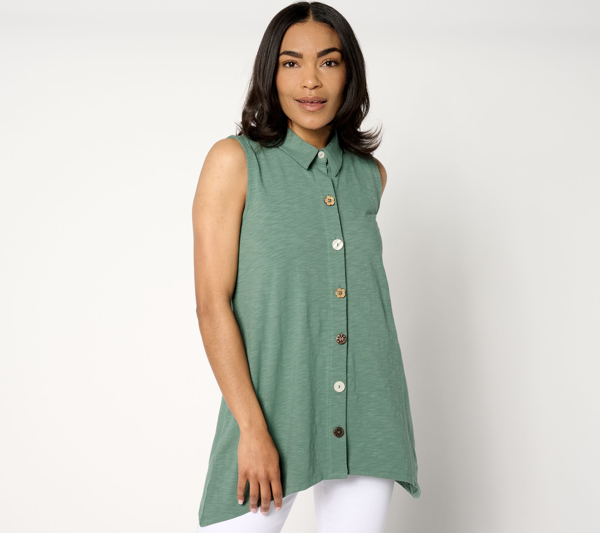 A faultless, pulled-together piece for your go-go-go days, this adaptive sleeveless sharkbite hem top works beautifully with most any bottoms -- especially when you're not feeling cropped or tucked styles. And those charming novelty button details? Adaptive hook-and-loop closures are tucked underneath, to make for an easier get-ready routine. Brilliant! From Denim & Co.® Fashions.