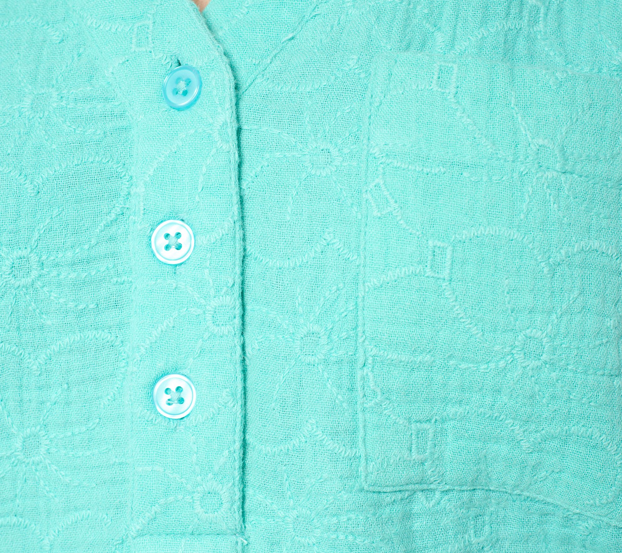 Features: three functional buttons at Y-neck placket, 3/4-length sleeves with encased elastic at cuff, smocking at shoulders/back yoke, bust darts, side slits
