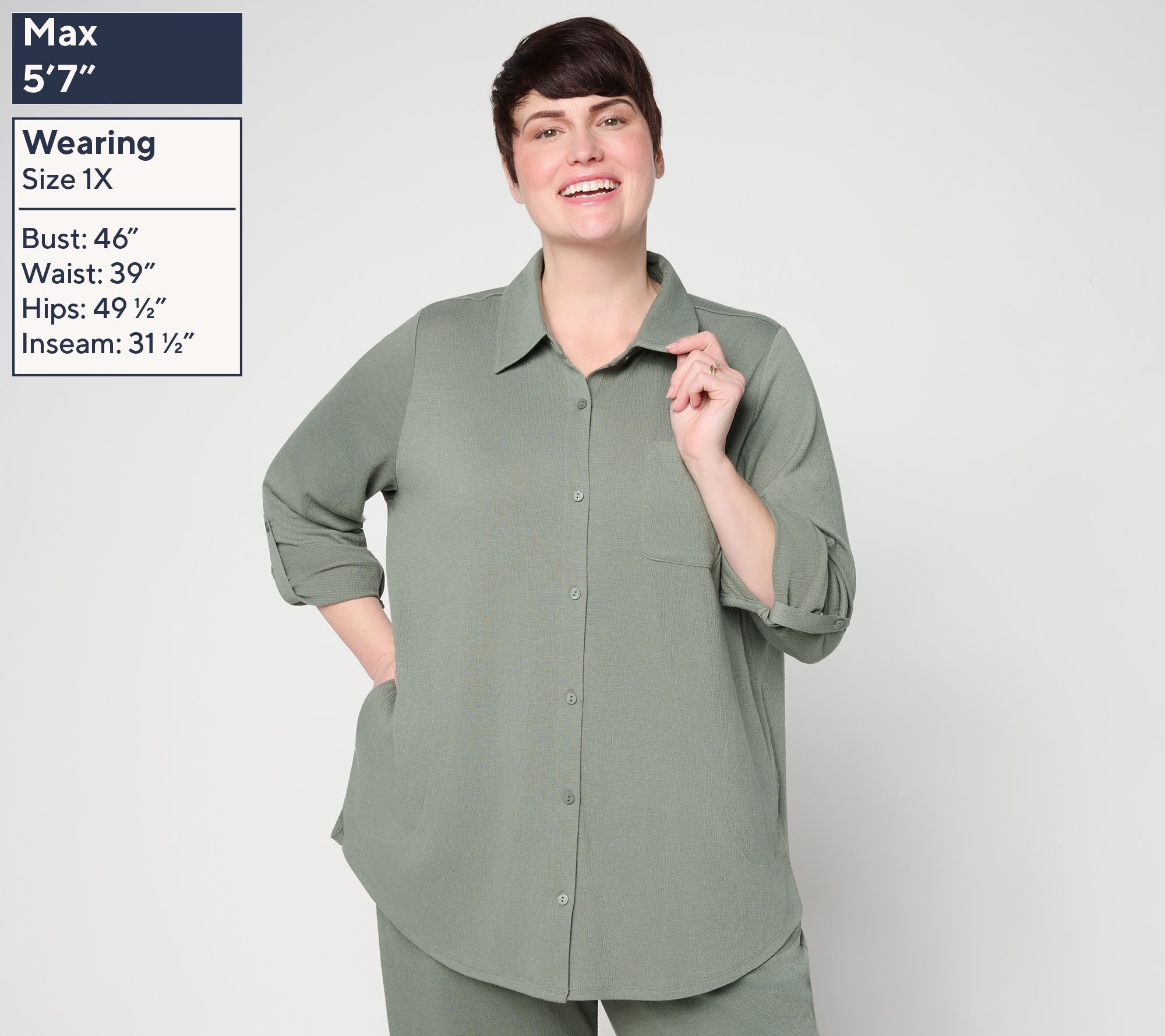 Light layers make for breezy days, and this button-front big shirt is ready for anything -- throw it on over your tank for a stroll by the boardwalk or wear it solo with jeans for a casual coffee date. Its airy knit gauze fabric and easy fit keep you comfortable, while thoughtful details like roll-tab long sleeves and plenty of pockets add practicality to your plans. From Denim & Co.® Fashions.