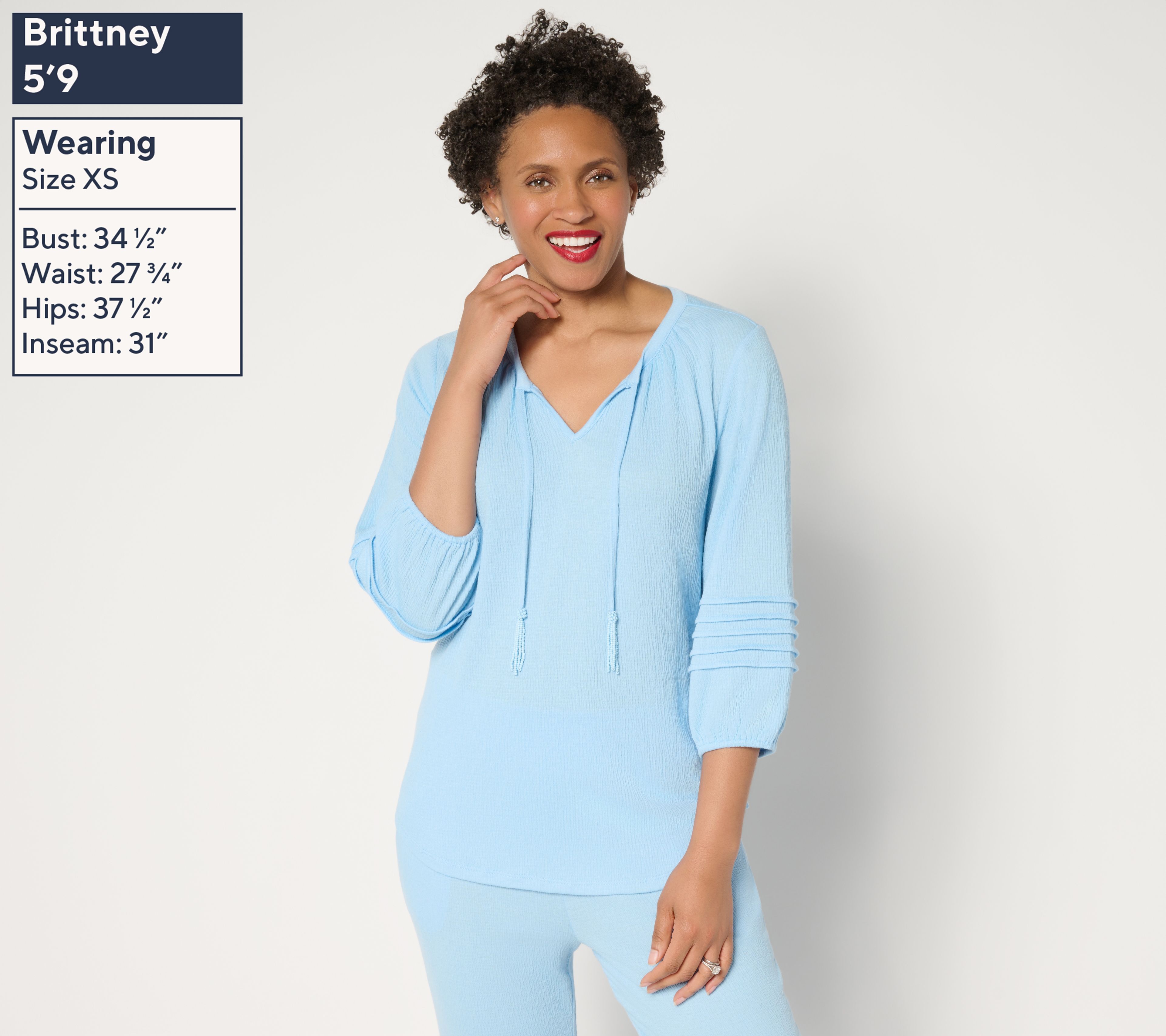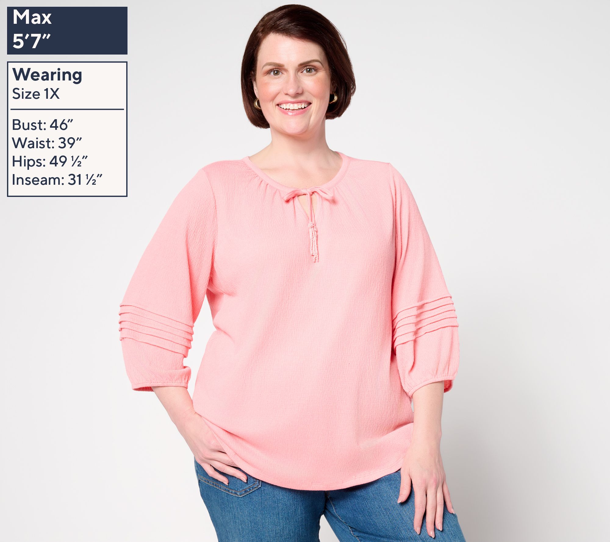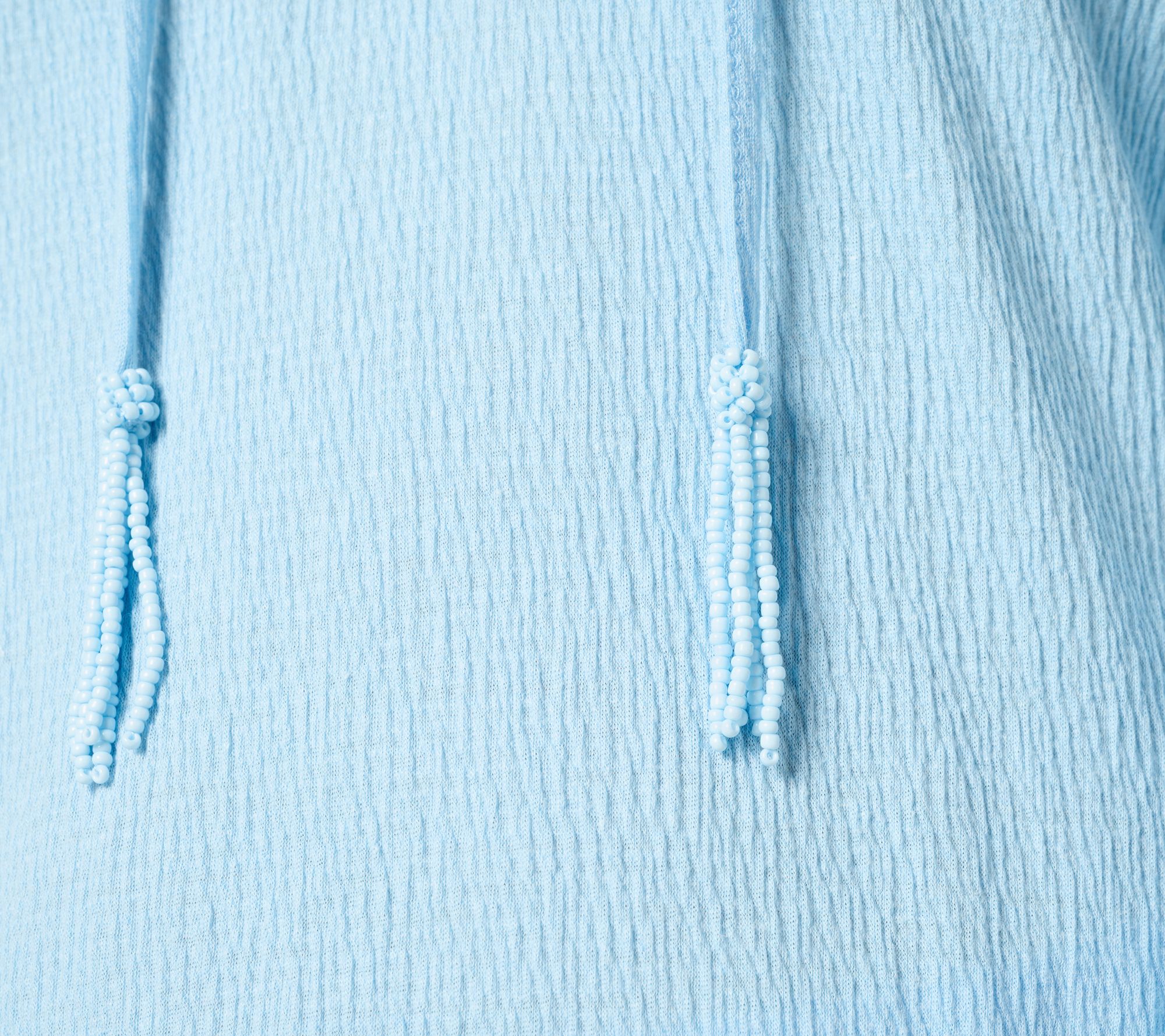 • Features: split neckline with tassels, 3/4-length sleeves with encased elastic, shirred neckline, pleating details at sleeve, curved bottom hem
