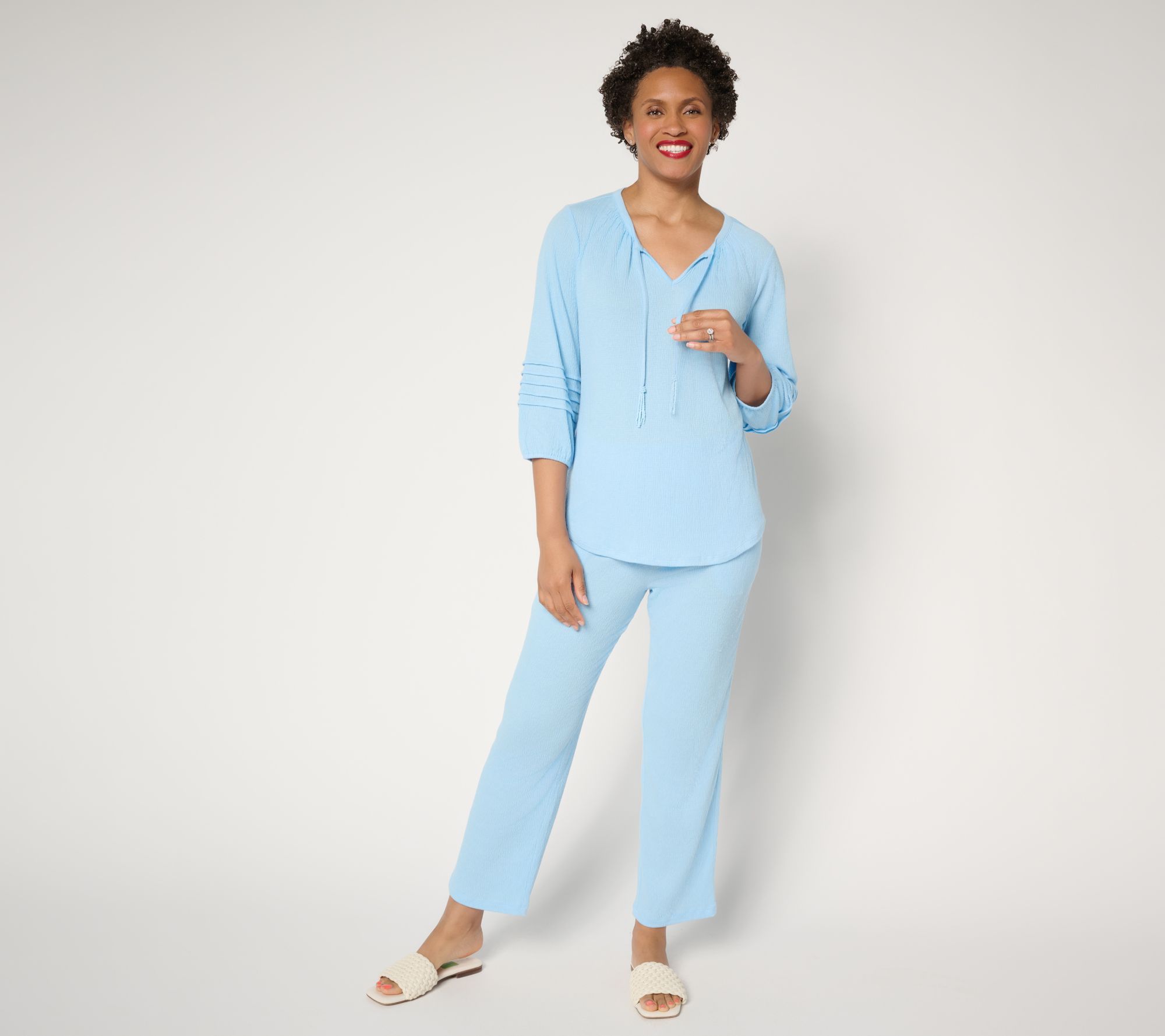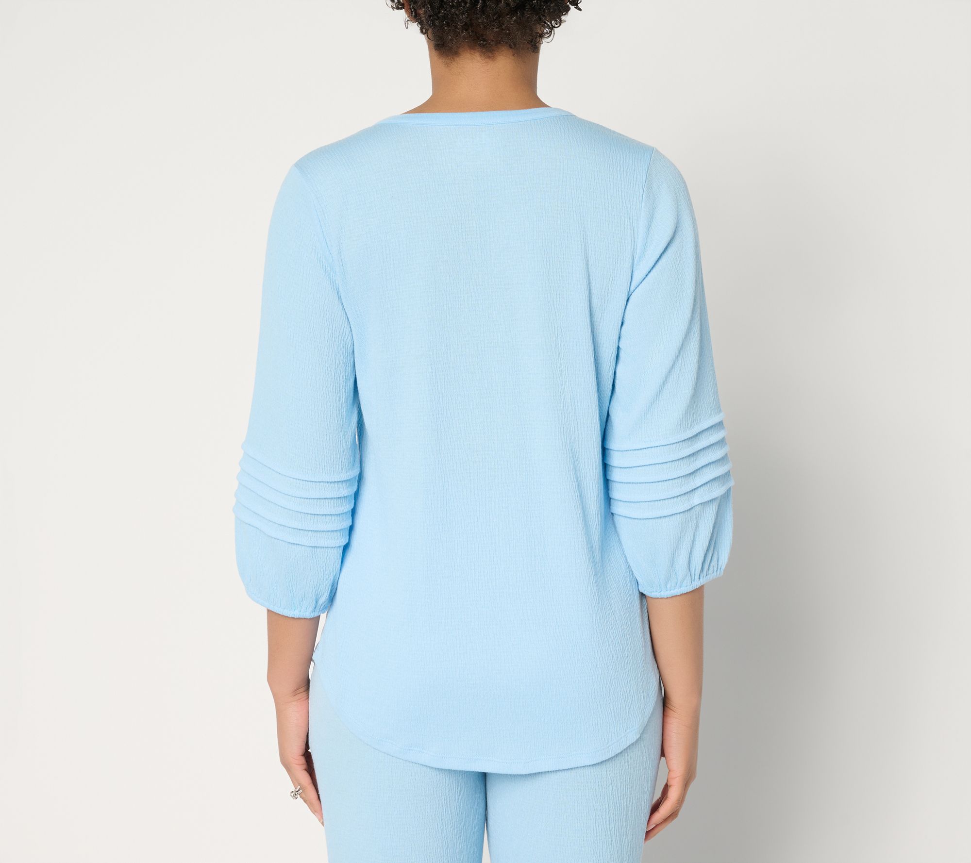 The weather app says what?! This split-neck top in airy knit gauze meets climbing temps with the easy, carefree comfort of a day by the sea. From Denim & Co.® Fashions.