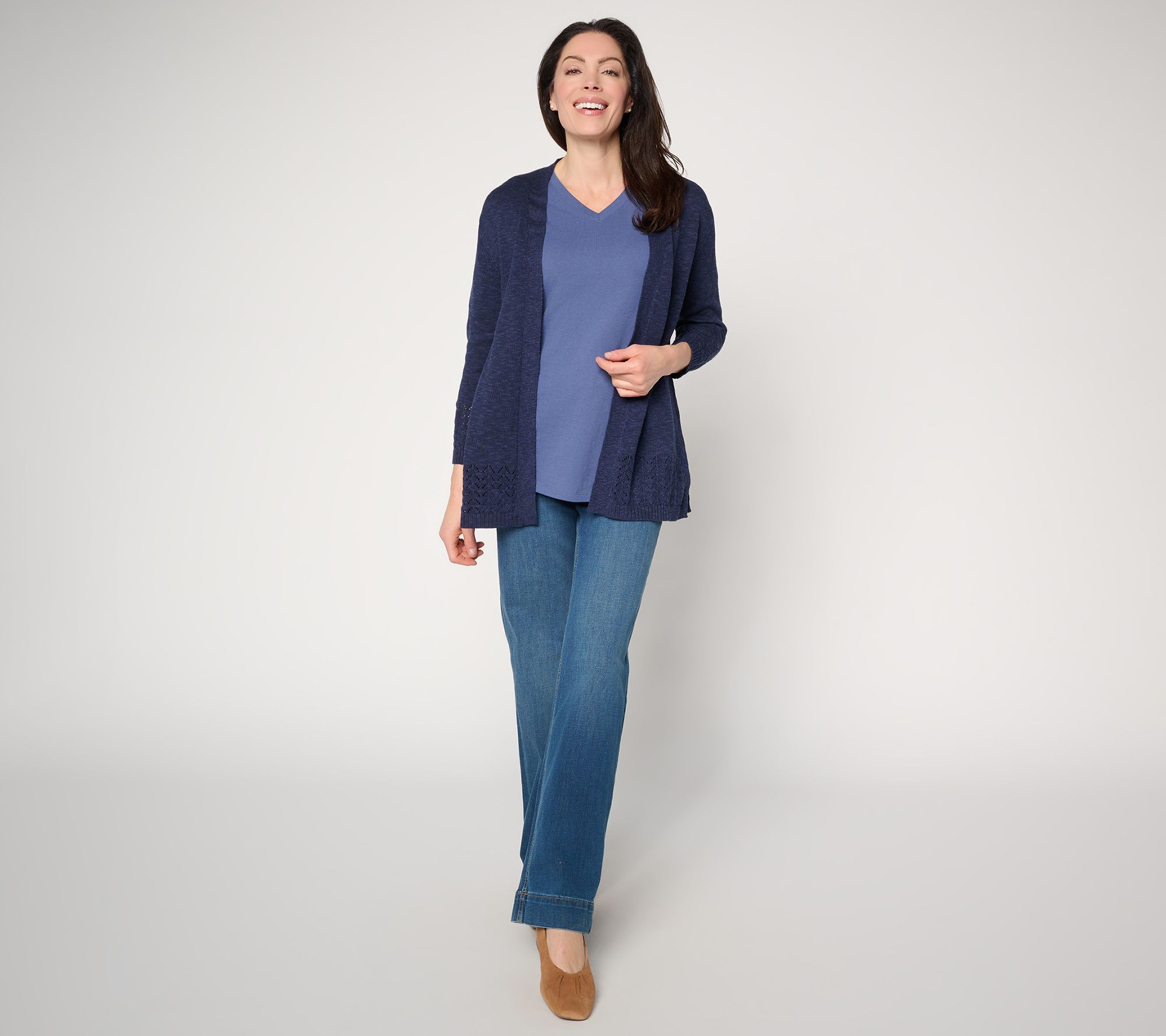 Stroll along the boardwalk or enjoy a breezy evening in this beachy cardigan that lends effortless charm through its pointelle stitching and open front design. The dropped shoulder and long bracelet sleeves offer relaxed sophistication, layering easily over dresses or casual separates on busy days. From Denim & Co.® Fashions.