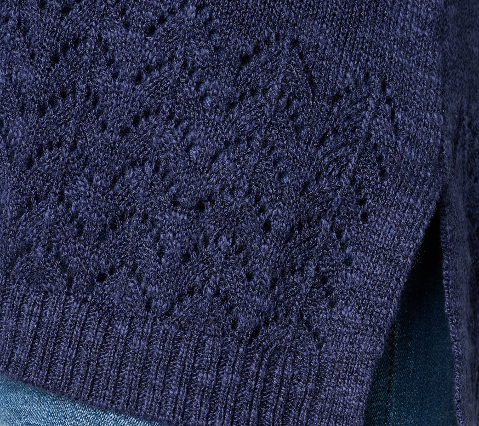 • Features: open front, rib placket, drop shoulders, pointelle stitch at bracelet sleeves and straight bottom hem, side slits
