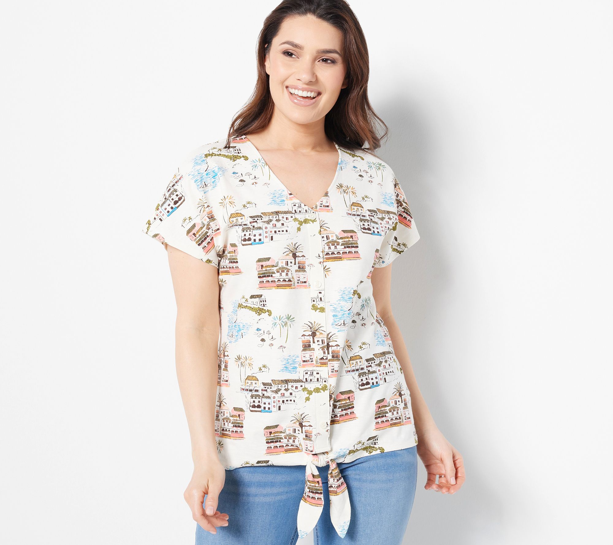 This oh-so-cute tie-front top gives you a playfully chic option for your summertime vacations and an easy breezy feel for when those scorching hot days roll into town. From Denim & Co.® Fashions.