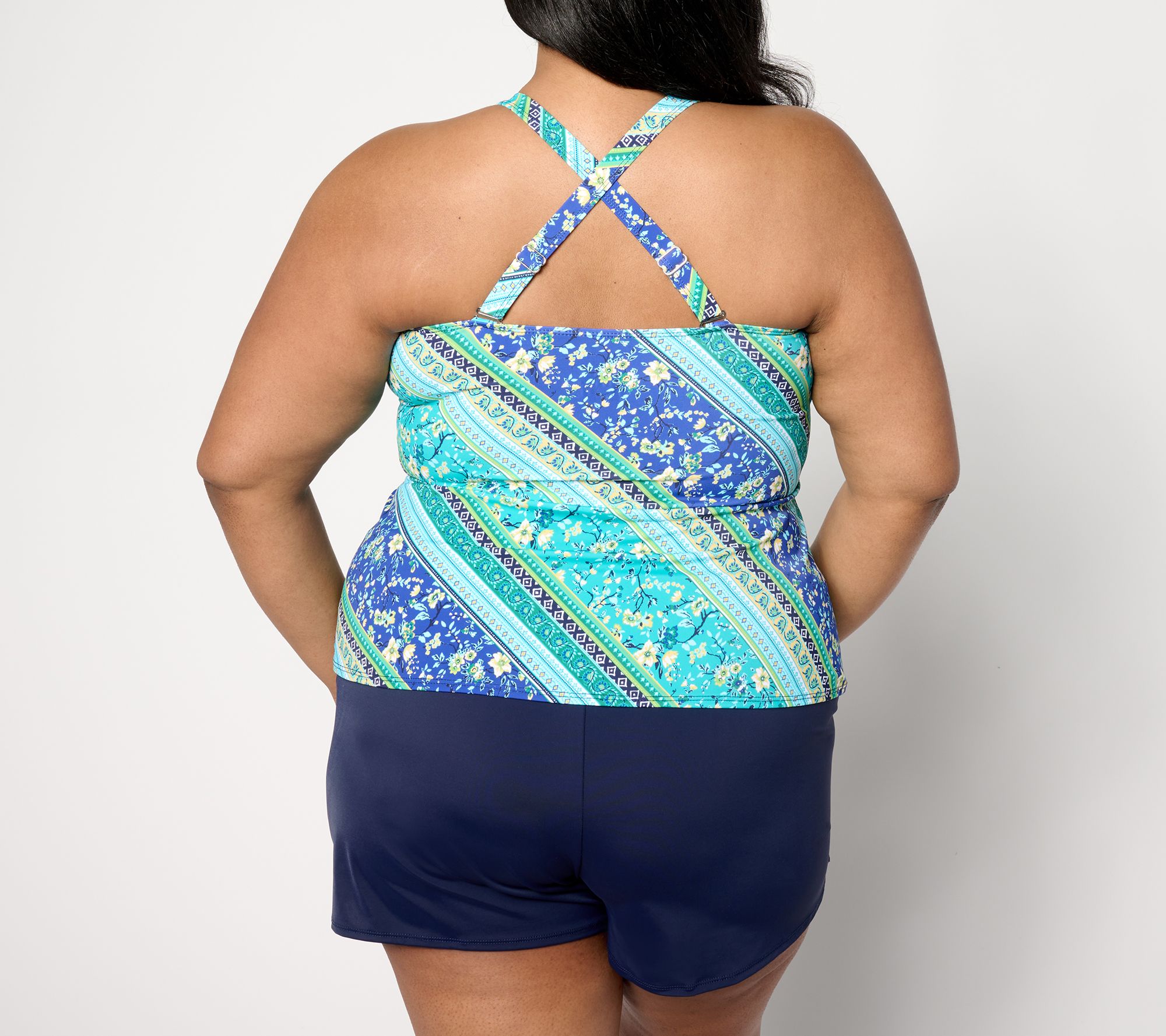 Pool parties and beach days are calling! Get ready to make a splash with this wrap front tankini with swim shorts. Designed with a self-fabric band to cinch the front strap, this tankini offers style and support. The convertible back strap adapts to your preference, helping you create the right fit for every adventure. From Denim & Co.® Fashions.