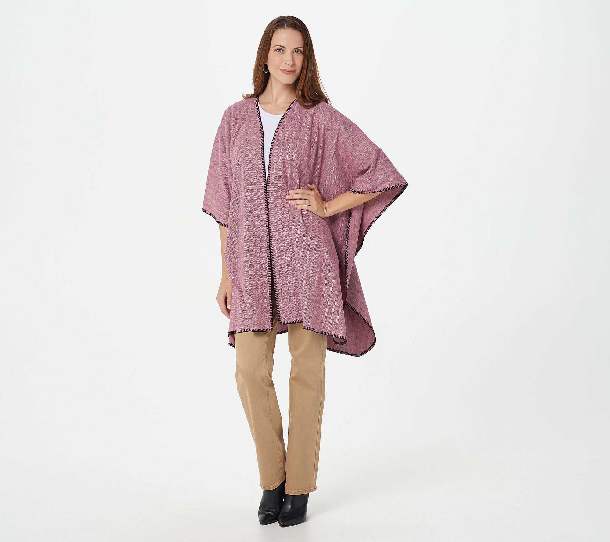 • Features: open front, blanket stitch detail, herringbone print, poncho silhouette