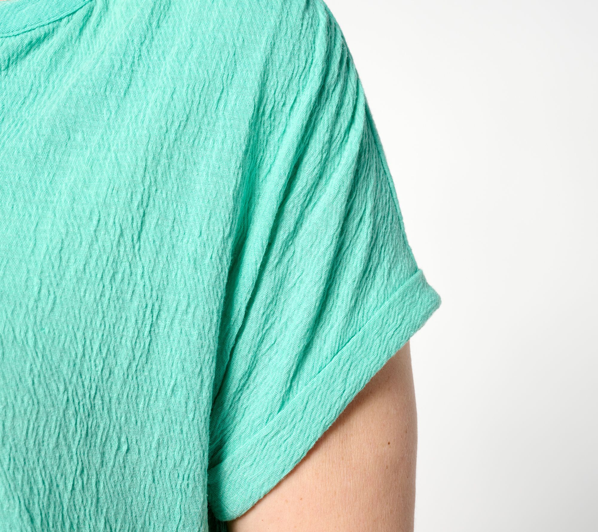 • Features: split V-neckline, short dolman sleeves with shirring detail, shirttail hem