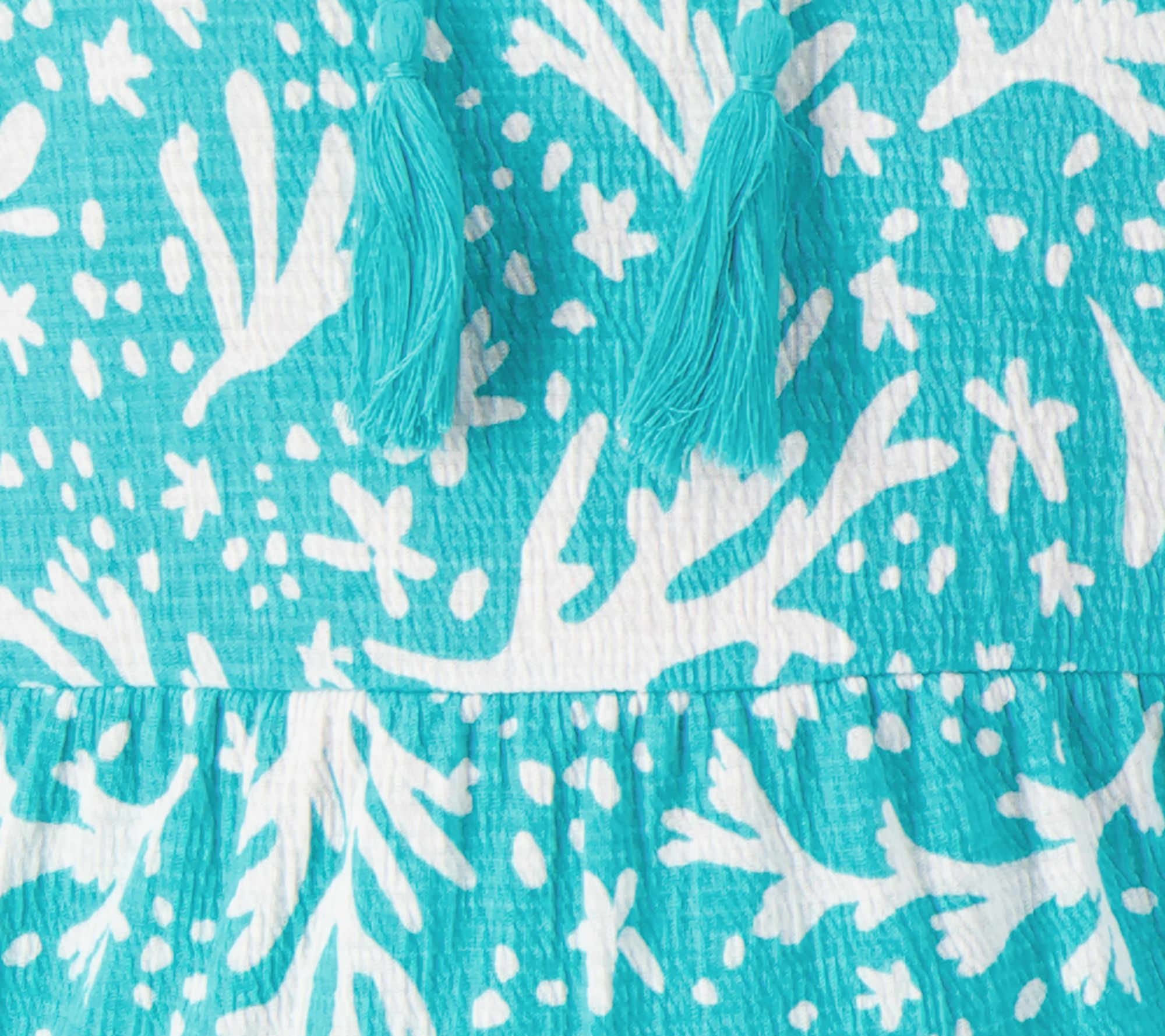 • Features: split V-neck with tasseled ties, ruffle stand collar, sleeveless, two tiers at bottom