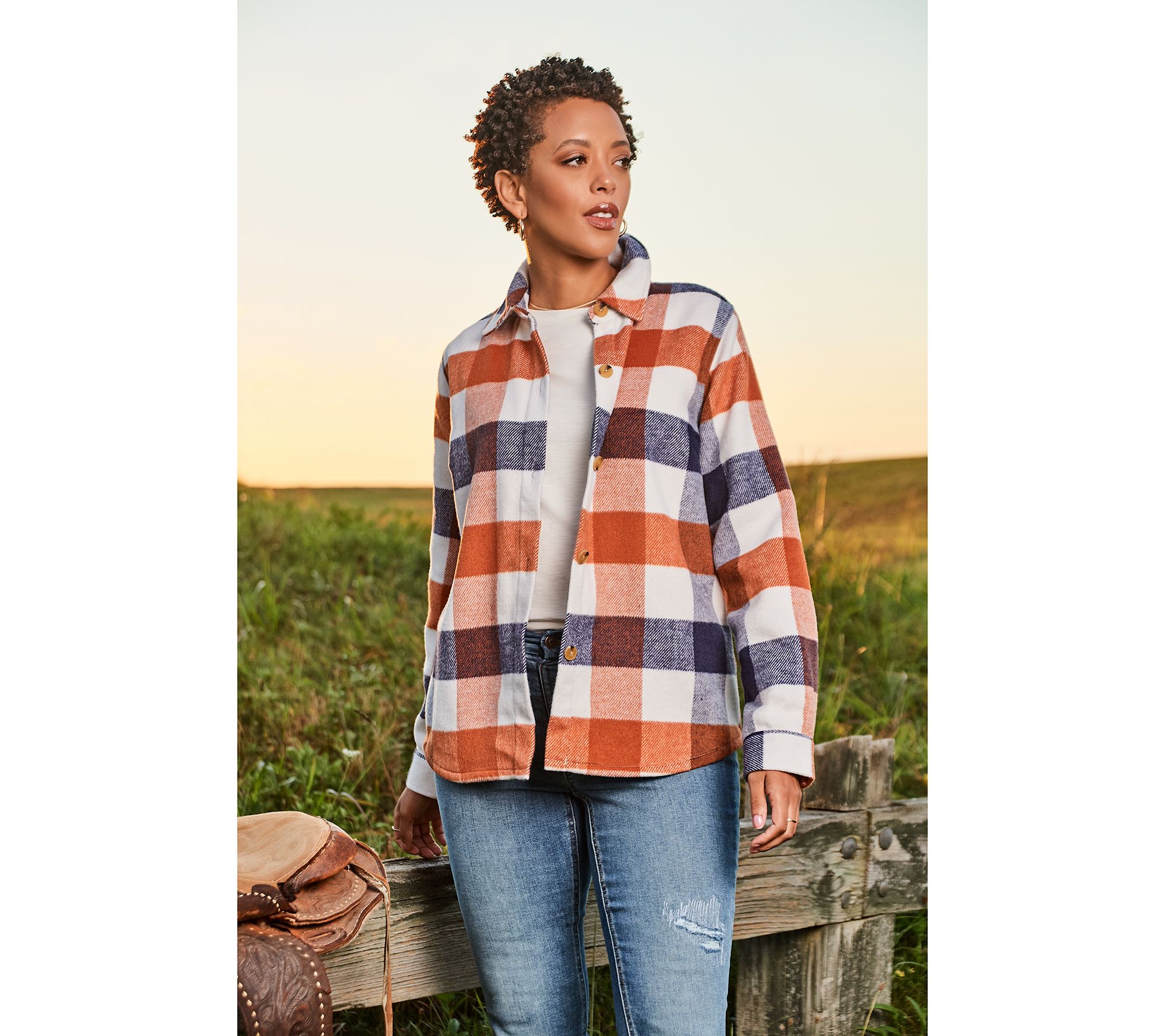 Ready for that bonfire, hayride, or fall photo shoot? You are now! This plaid shacket is just what you need to complete your autumnal attire. From Denim & Co.® Canyon RetreatTM.