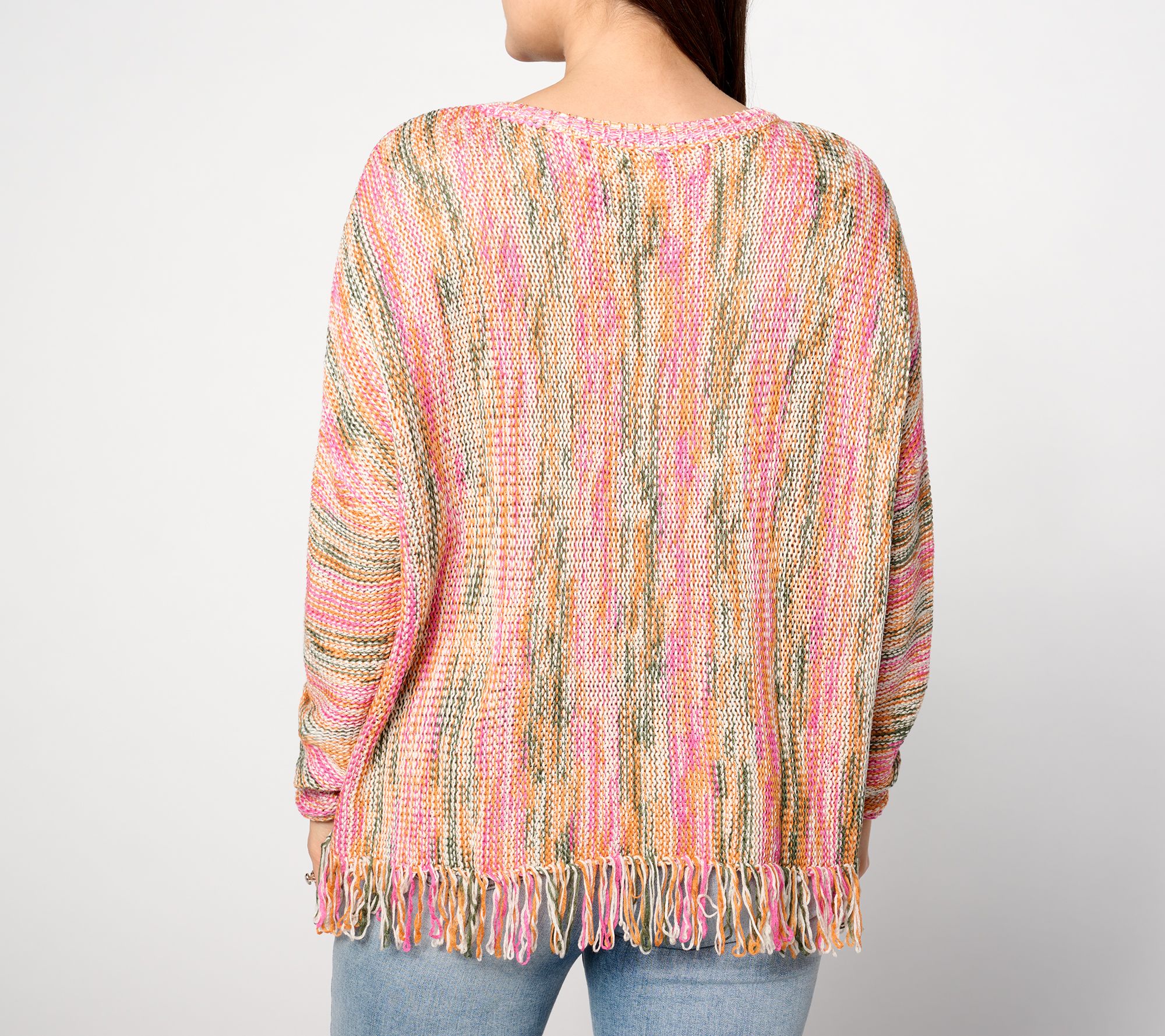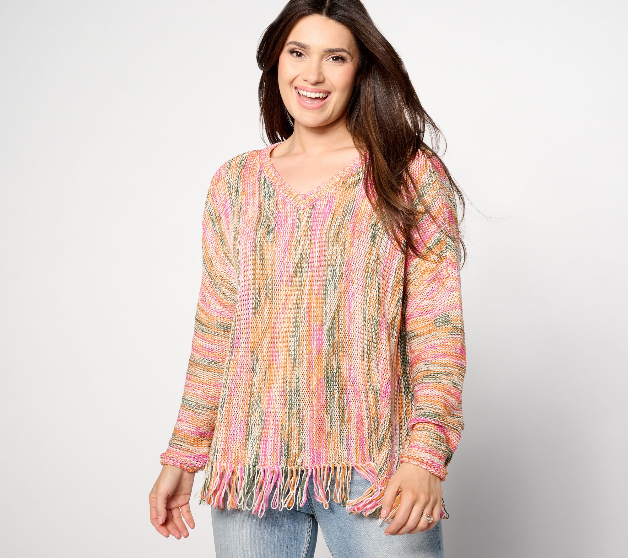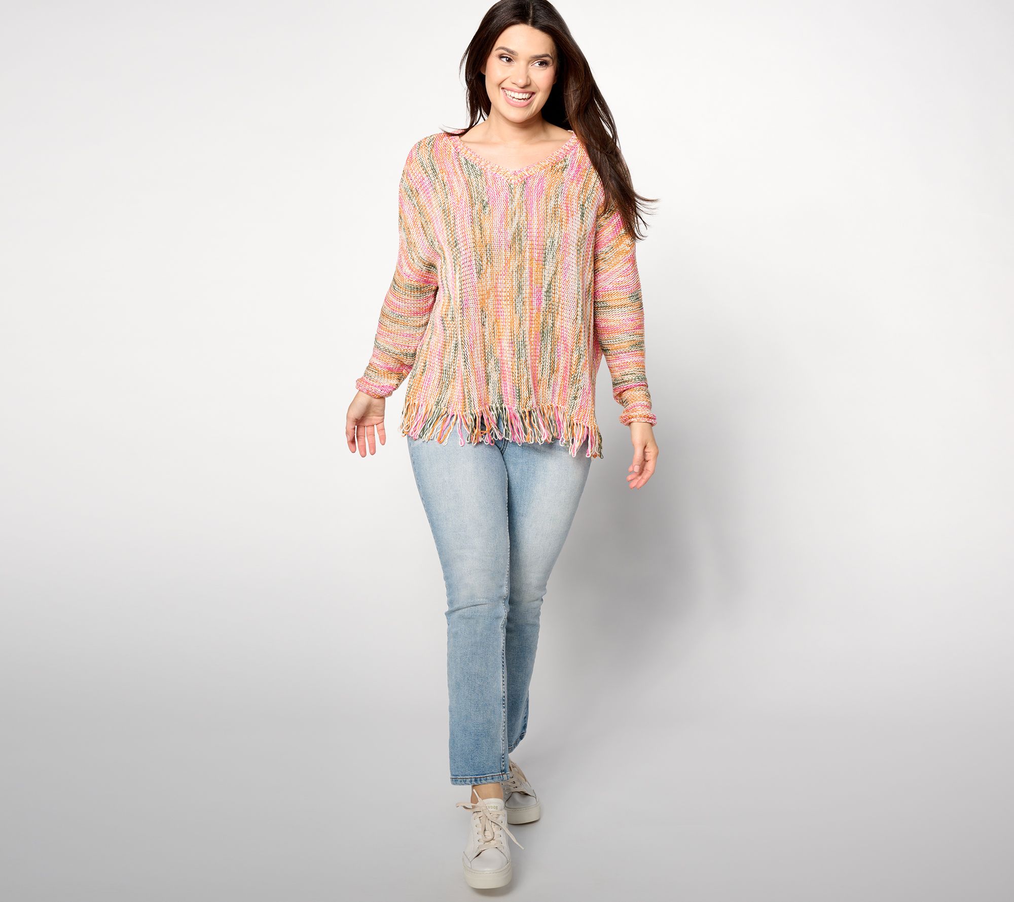 A little distinctive and oh-so fashionable, this pullover stands out with a fringe hem, drop shoulders, and a relaxed fit. Pair it with anything from jeans to leggings to shorts (for those cool nights spent walking along the beach). From Denim & Co.® Fashions.