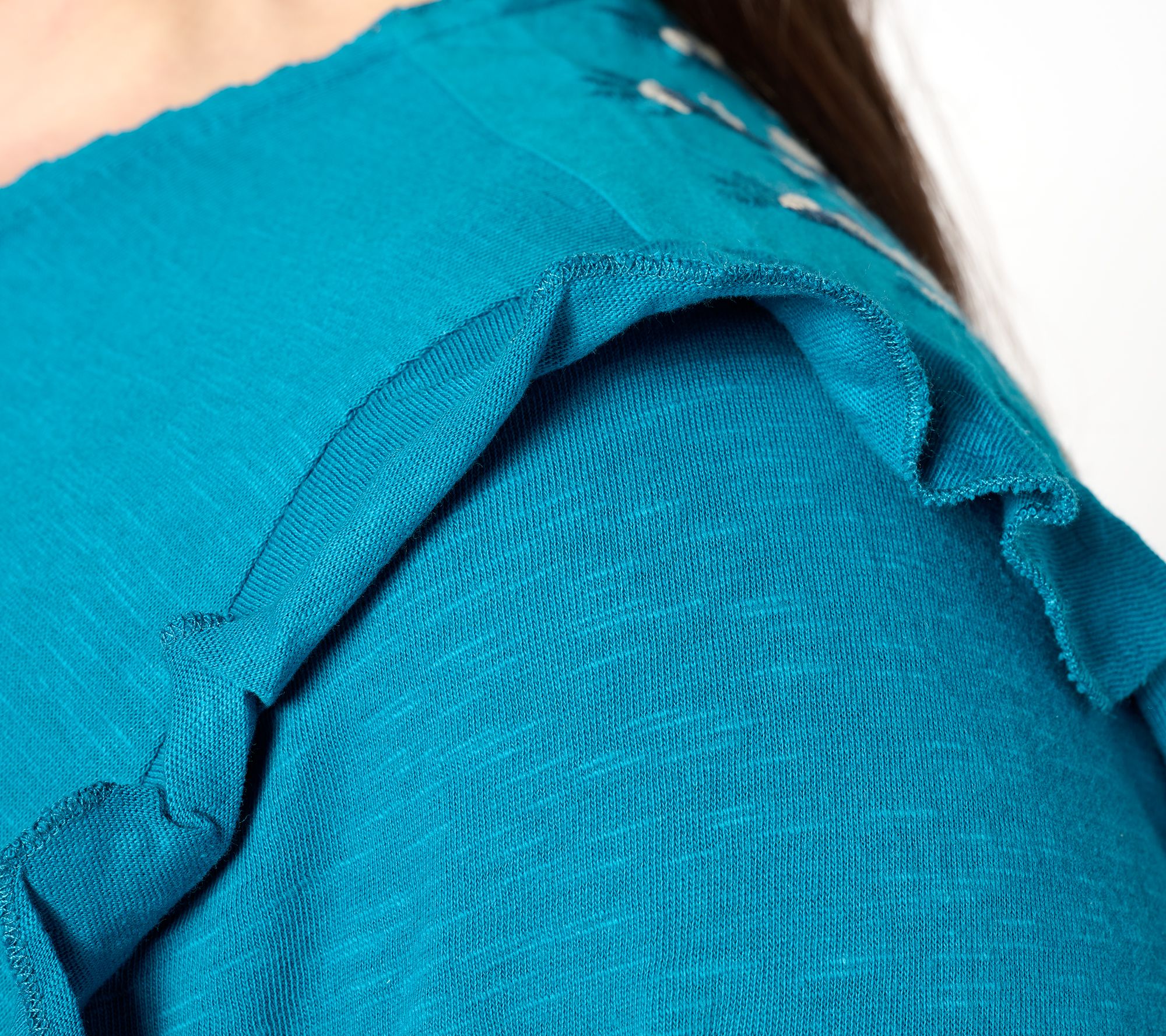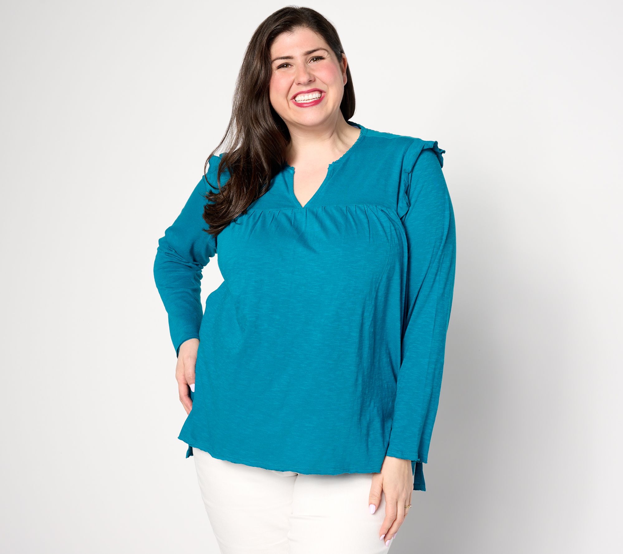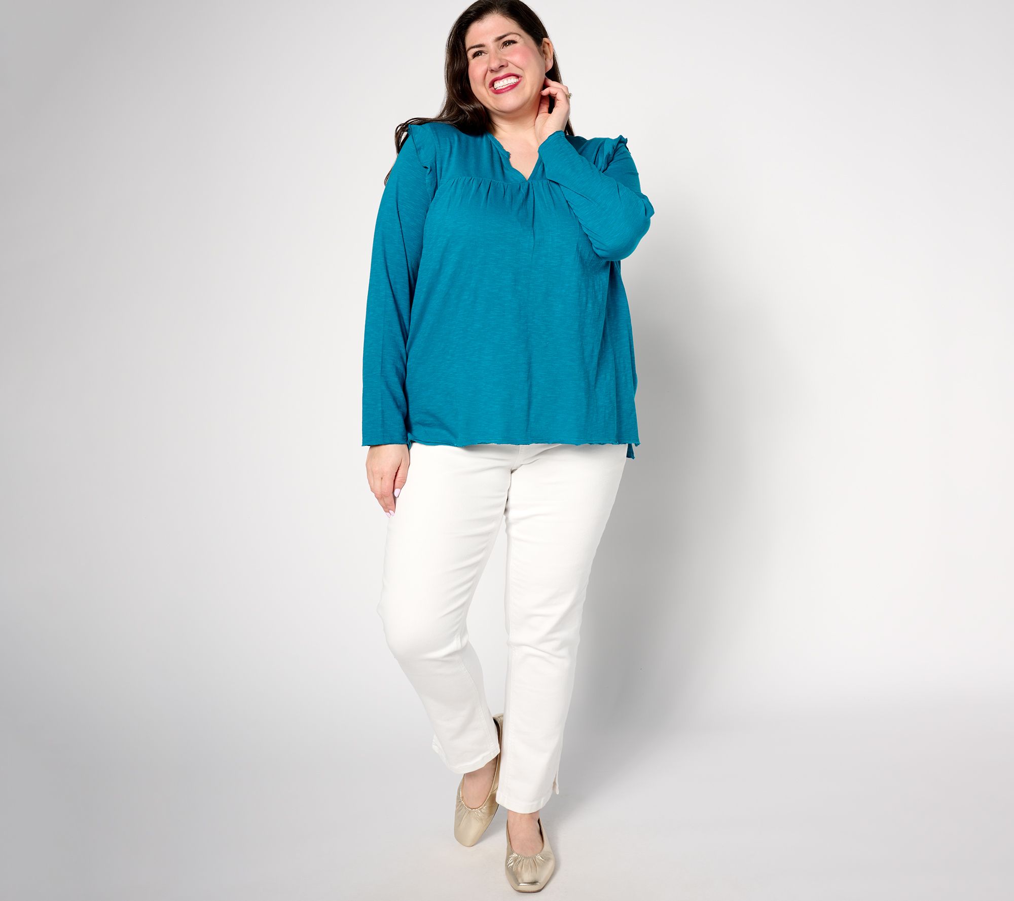 Sweet little details -- like a ruffled shoulder, split neckline, and embroidered back panel -- make this beautiful blouse a top option for date night with that special someone or a gathering with the girls. From Denim & Co.® Fashions.