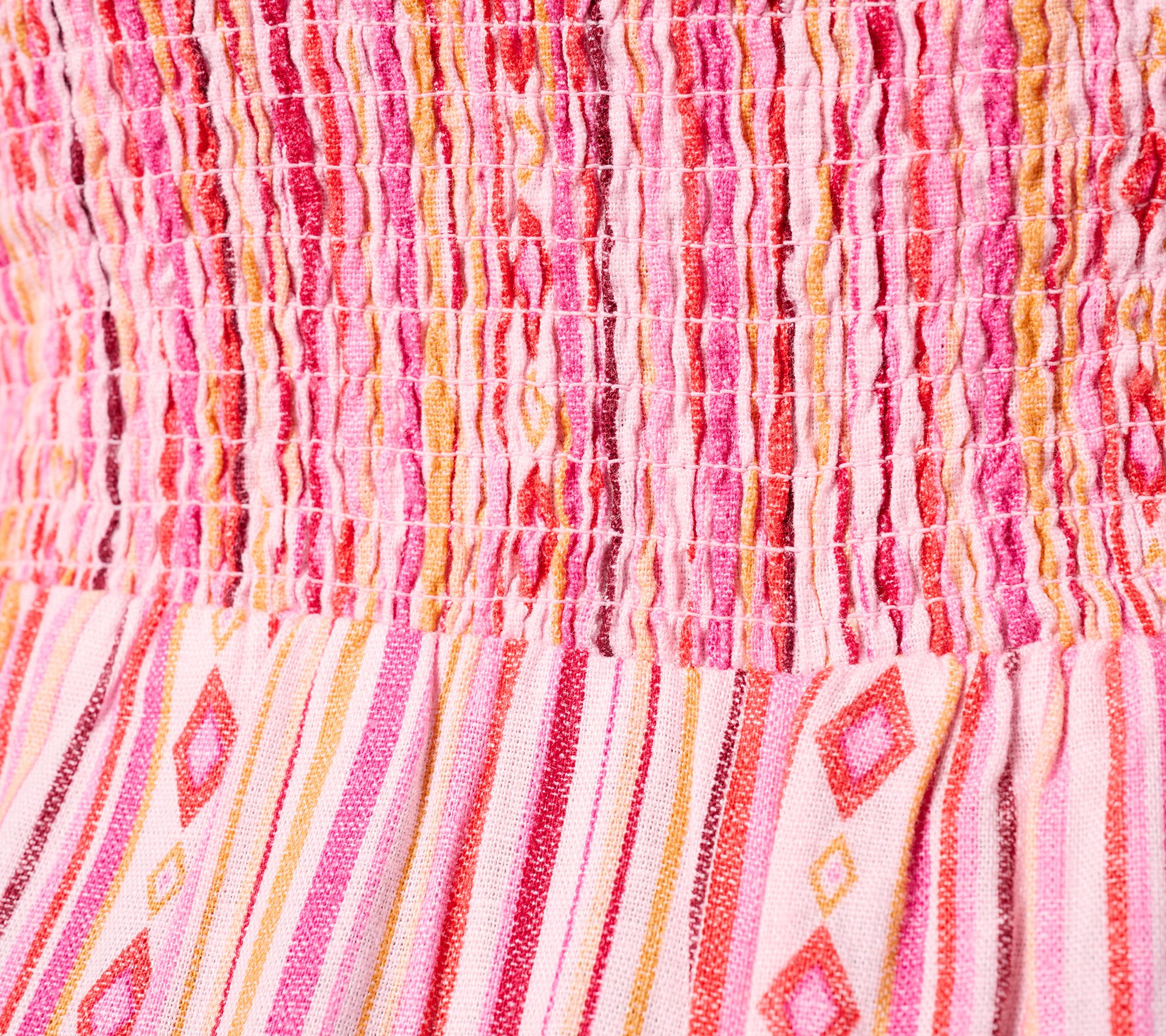 • Features: striped print, two-ply straps, smocking at back bodice, on-seam pocket