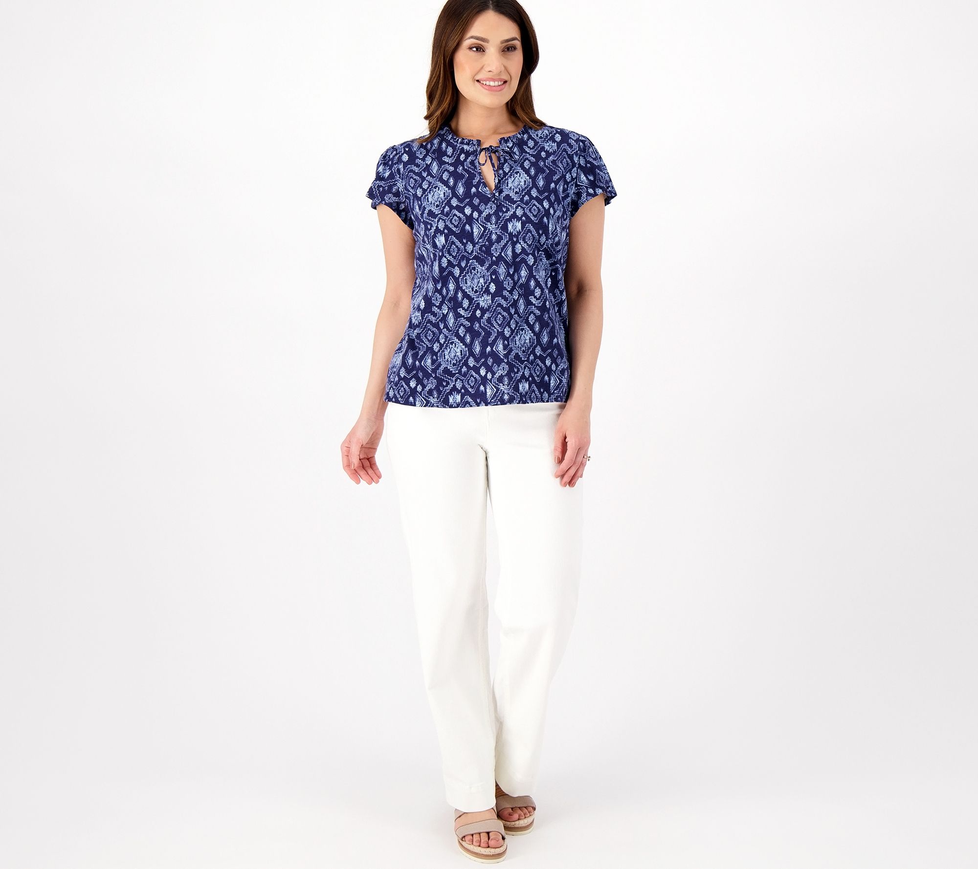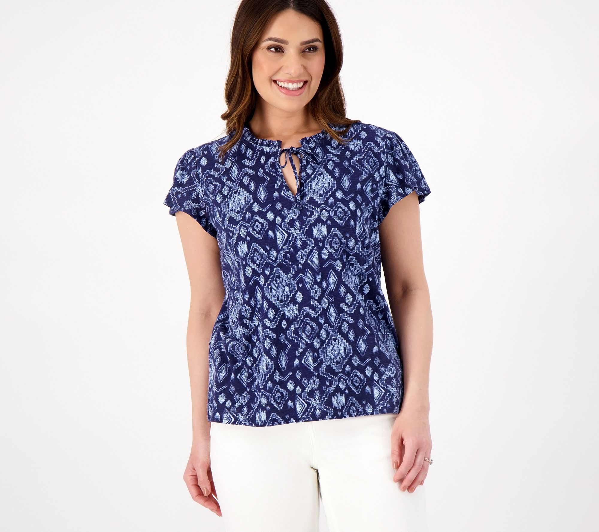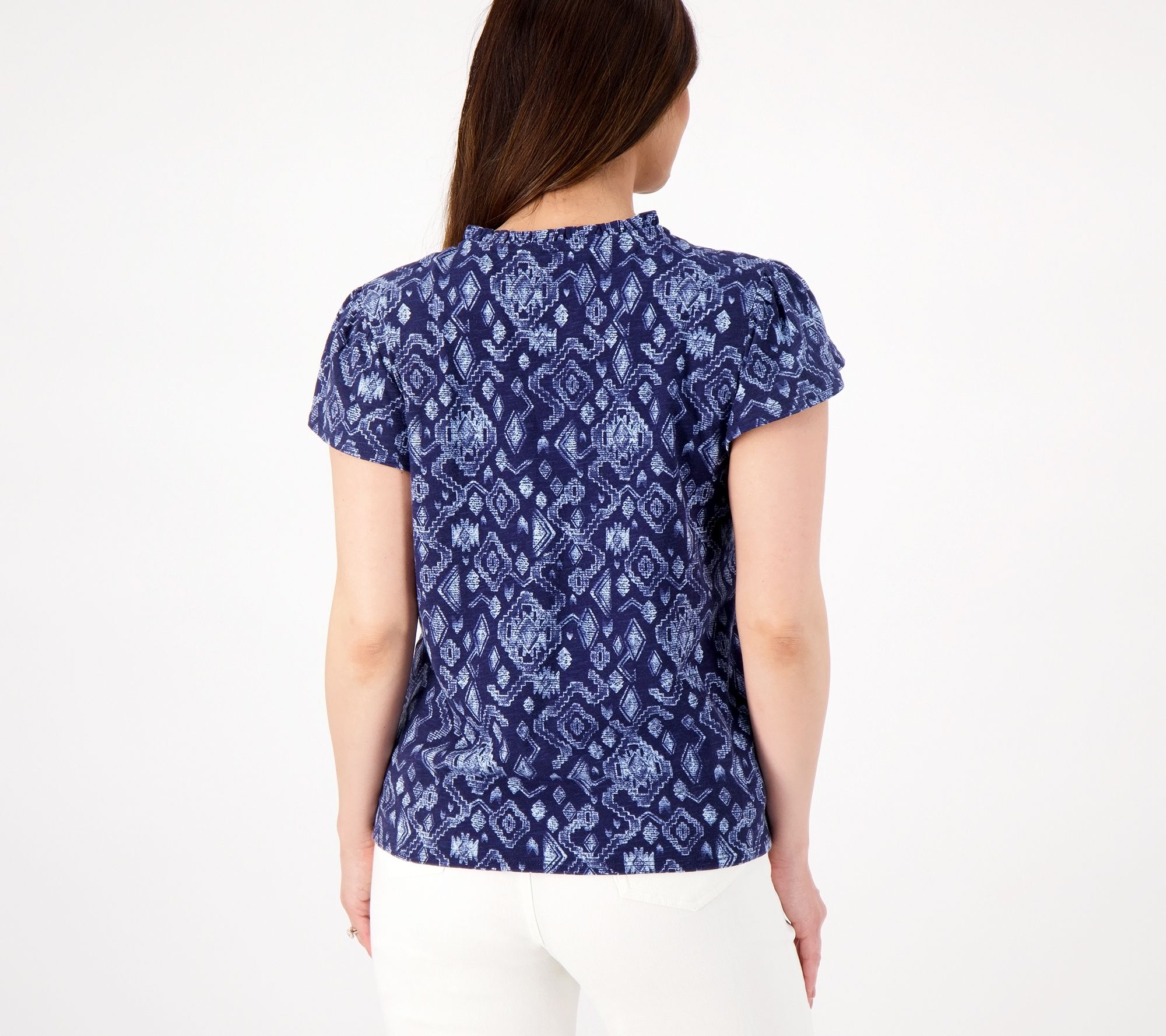 Paired with jeans and some wedge espadrilles, this printed, flutter-sleeve top is just right for a laid-back afternoon brunch or drinks and light bites at the new hotspot downtown. From Canyon RetreatTM.