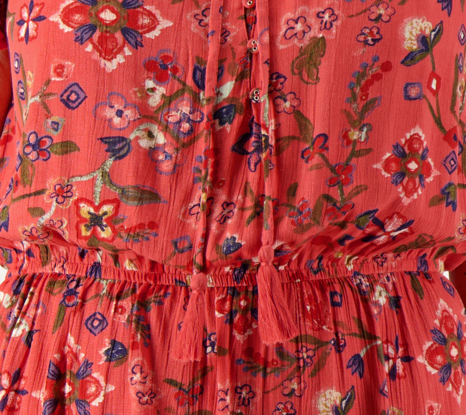 Look ever so chic in this Boho-inspired mini dress, featuring ladylike flutter sleeves, tassel detail, and a fabulous floral print. From Canyon RetreatTM.