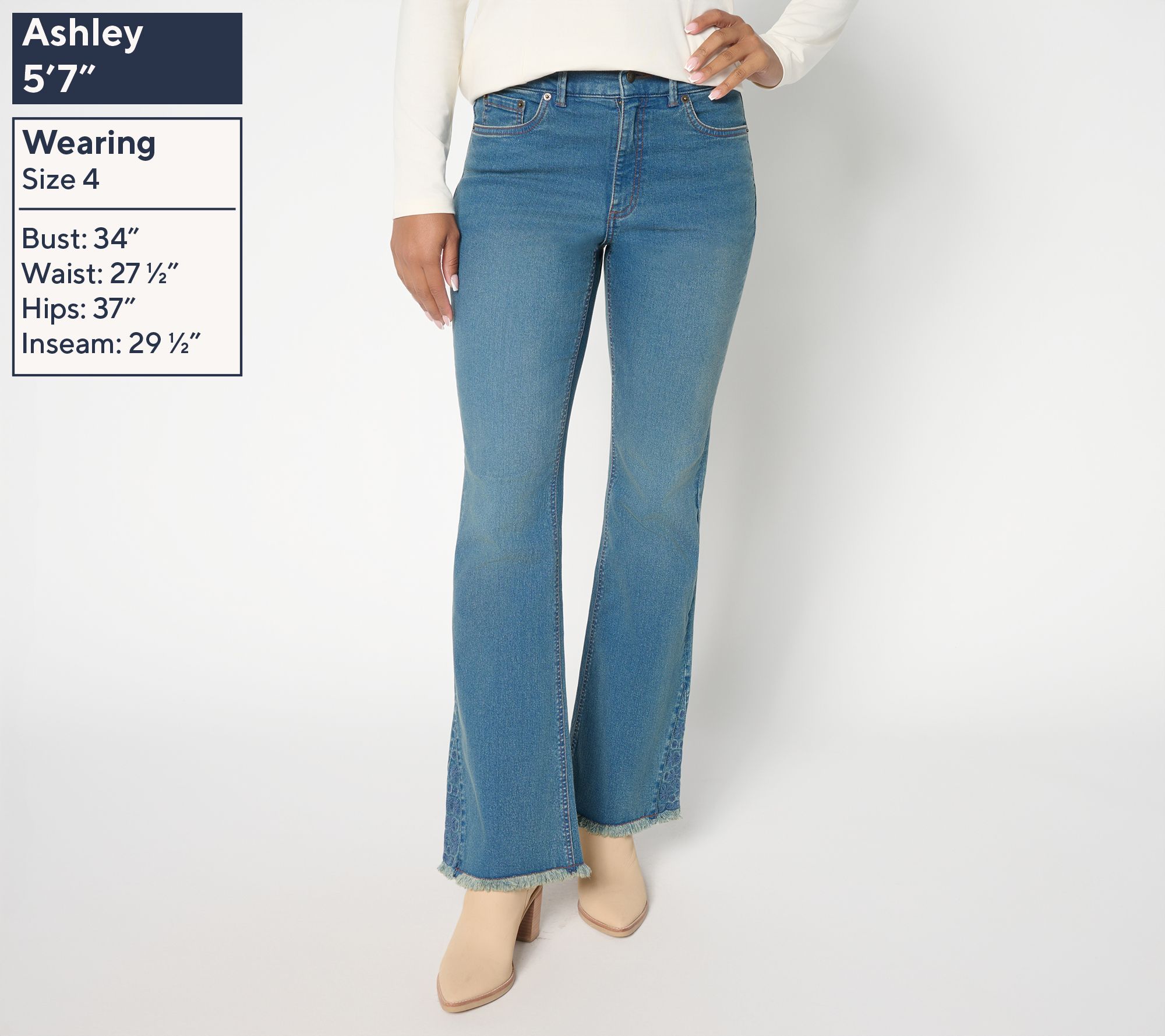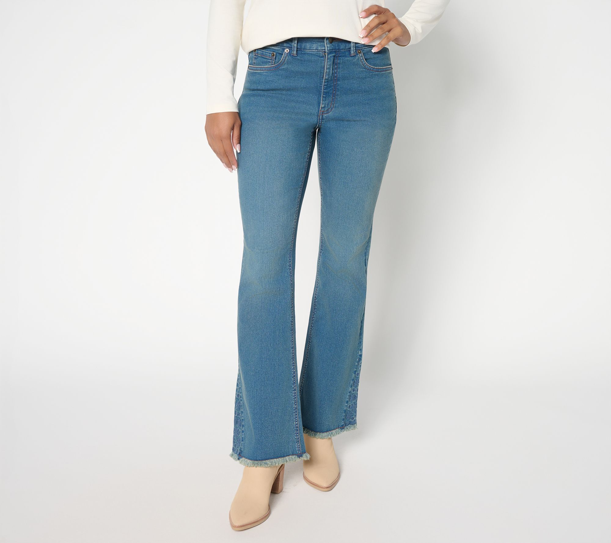 From sunset strolls to weekend trips, these boot-cut jeans work a Western moment into every style sitch. Eyelet godets and raw hems add a helping of flair -- 'cause it's not your first denim rodeo. From Denim & Co.® Fashions.