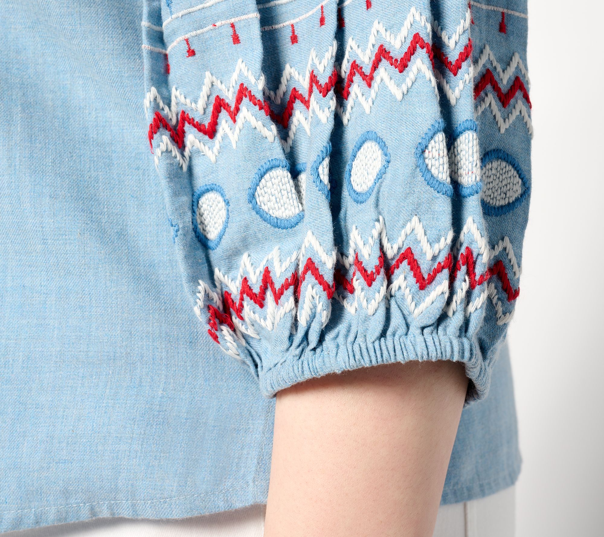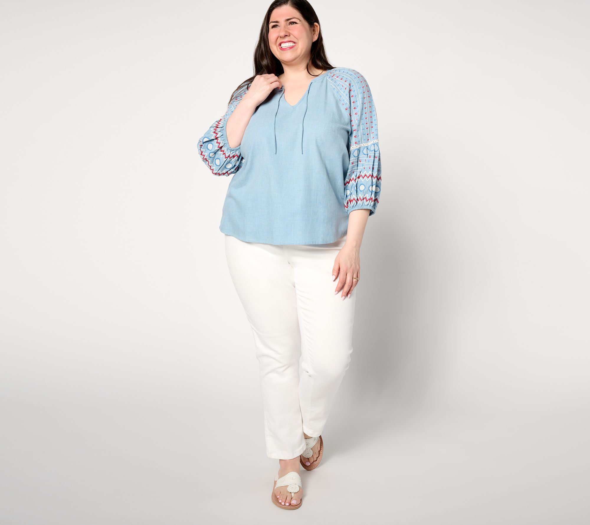 "As Is" Denim & Co. Canyon Retreat Split Neck Top w/ Embroidered Slv