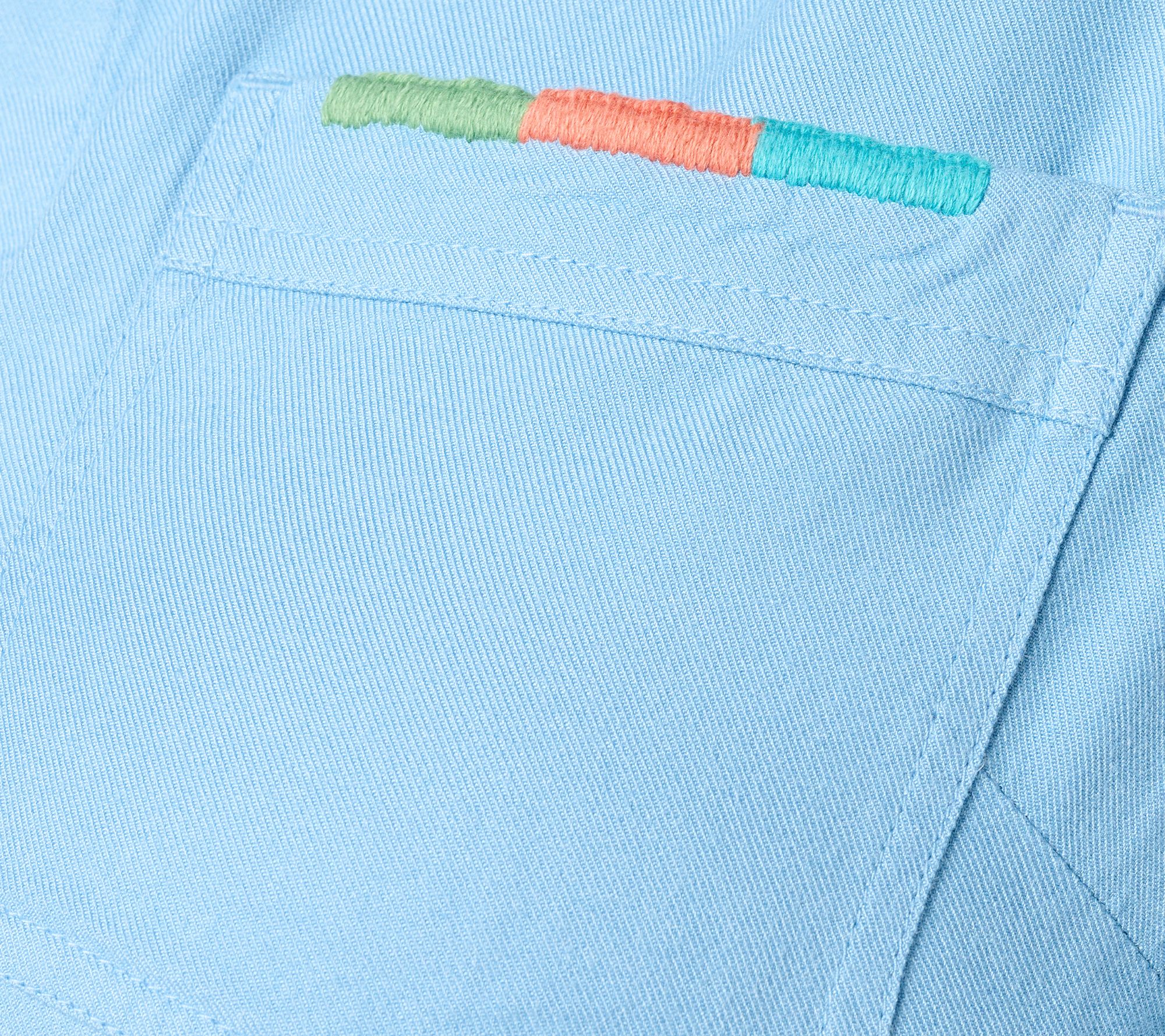 • Features: button-front closure, collar, roll-tab long sleeves, chest patch pockets, decorative colorful thread at top of one pocket