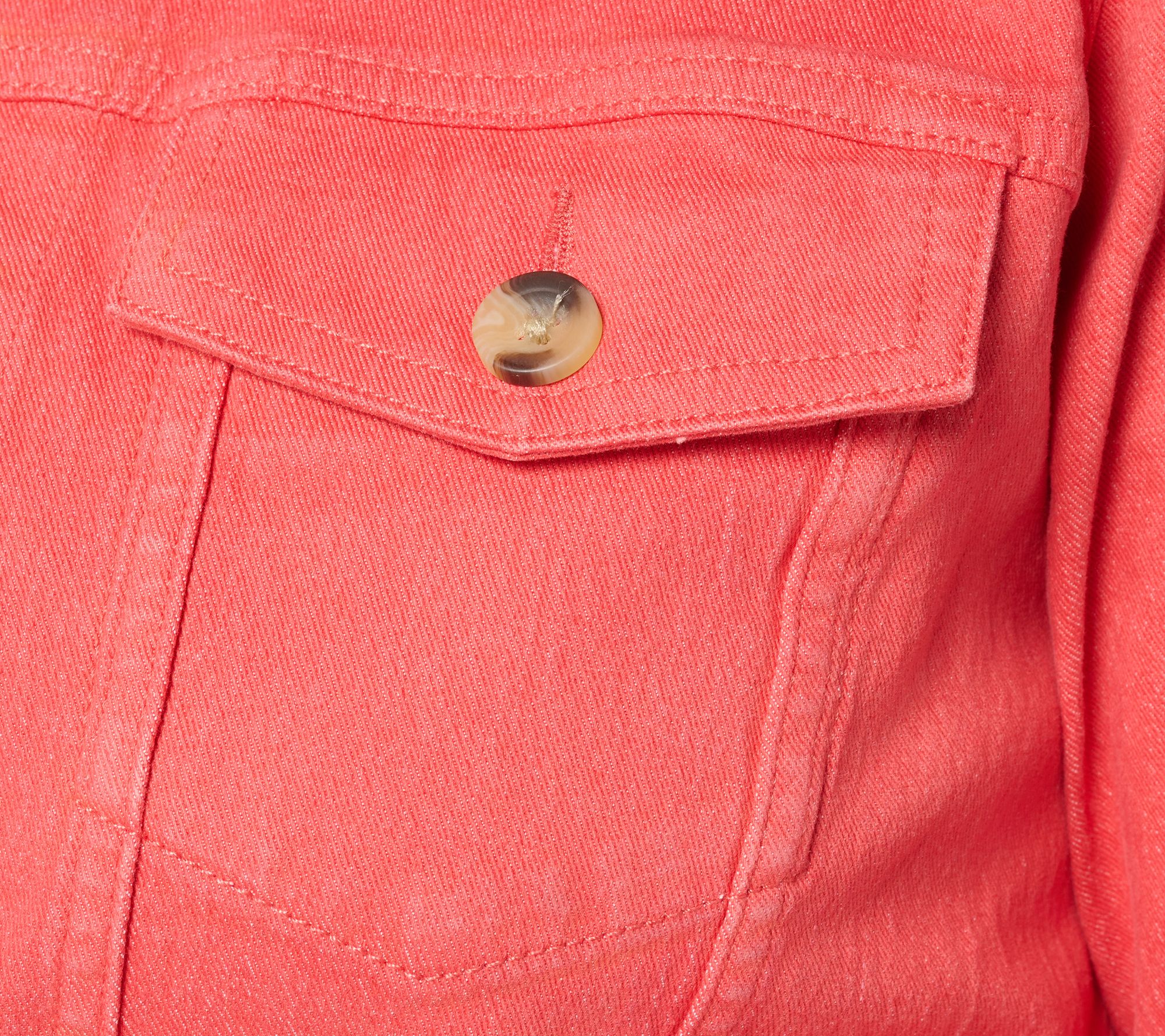 • Features: forward shoulder seams, collar, button-front closure with faux horn buttons, pocket flaps at chest, welt pockets, vented cuffs