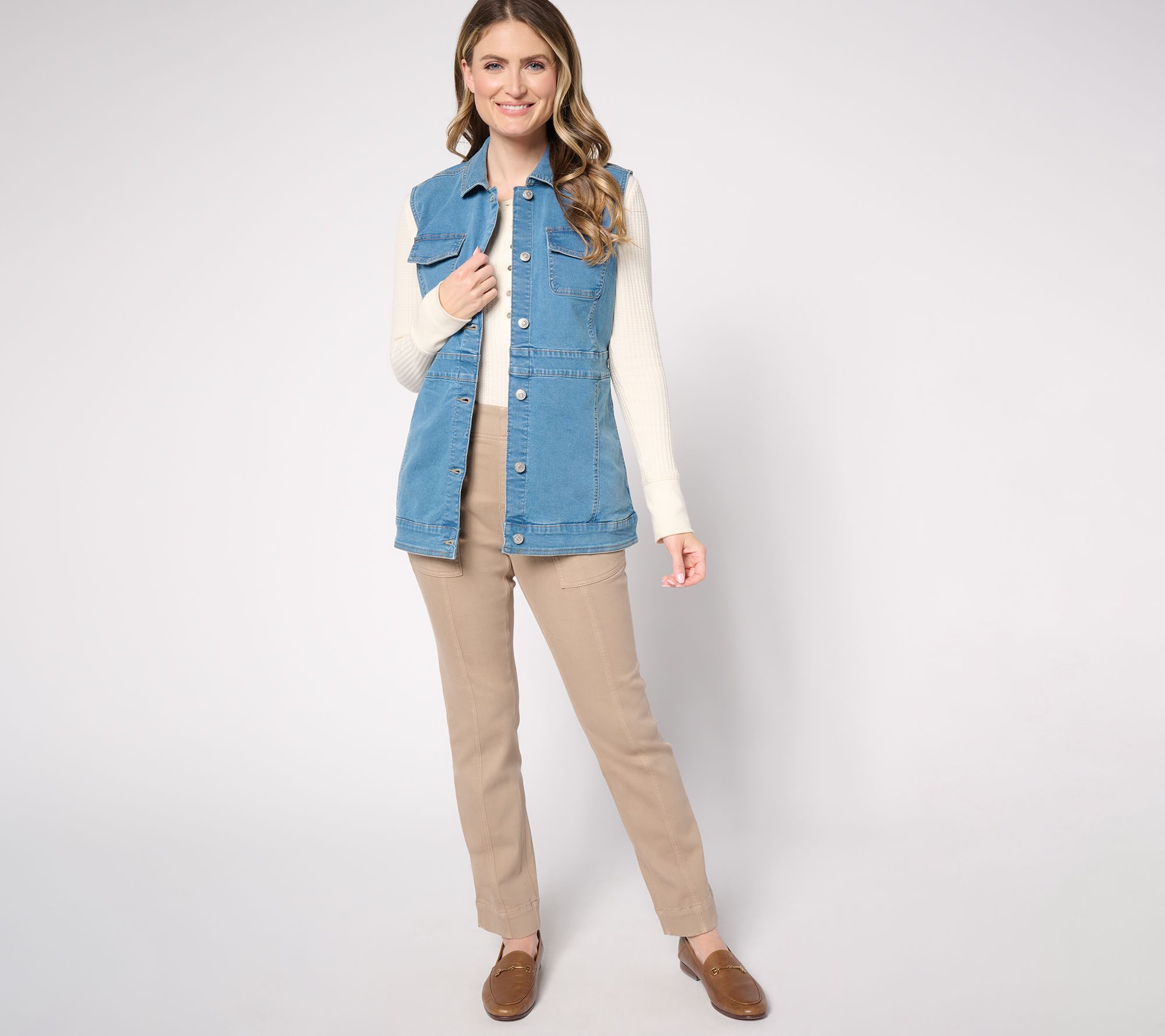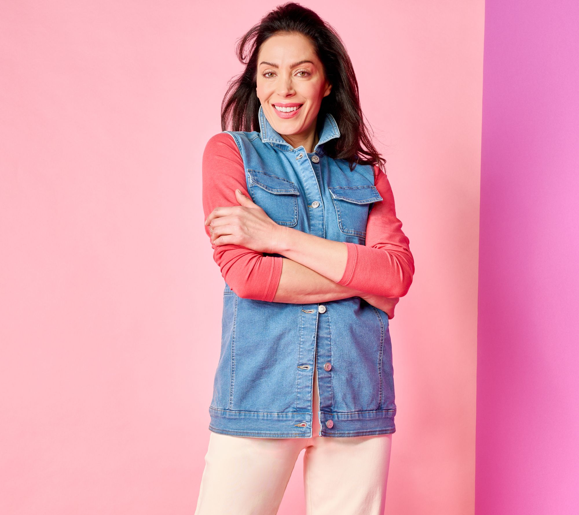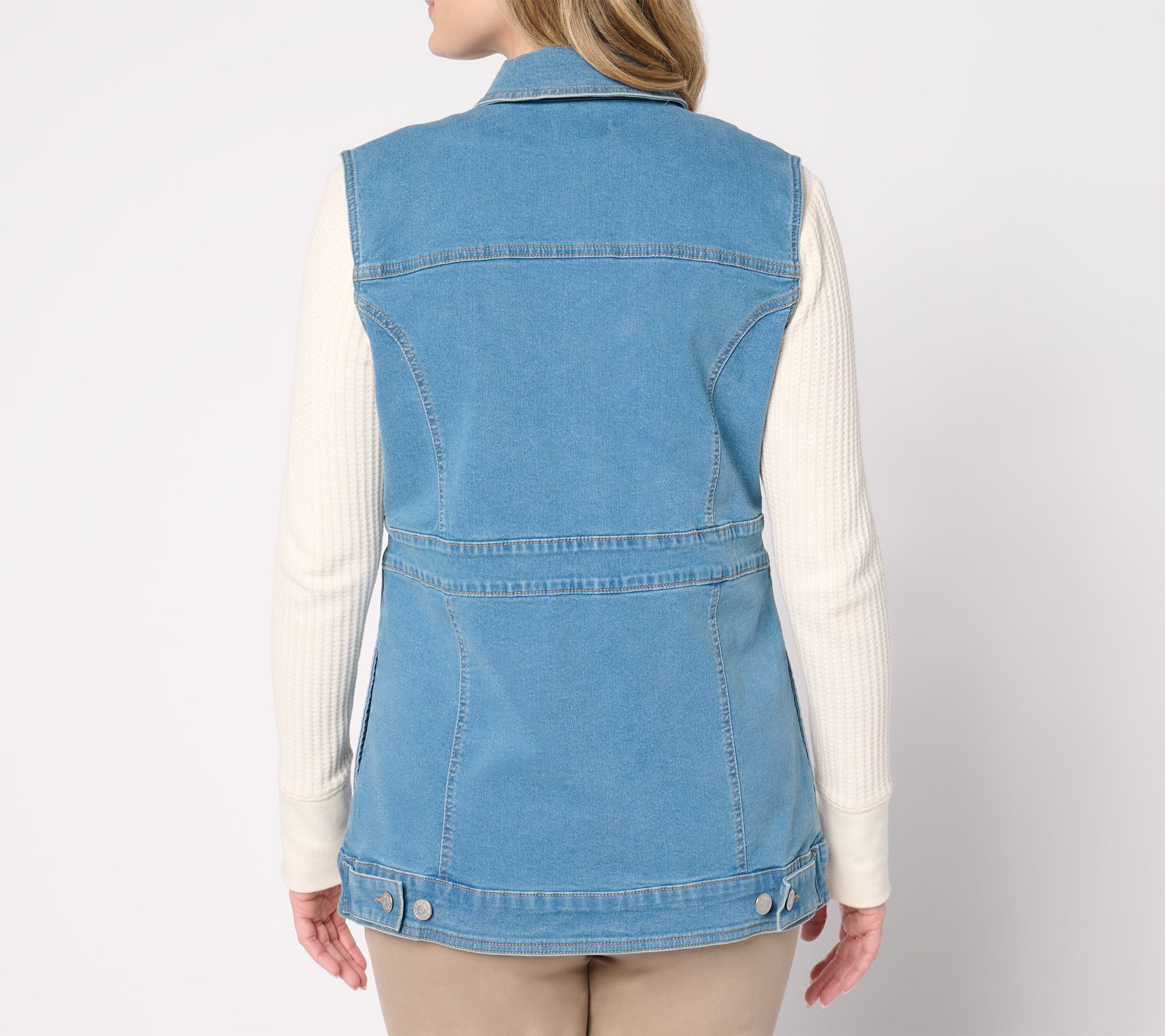 Denim vests are having a moment. We love this D&C take for its classic stretchy-smooth construction, extra bit of length (ideal for layering), and shape-flattering seam details that keep the overall look beautifully streamlined. From Denim & Co.® Fashions.