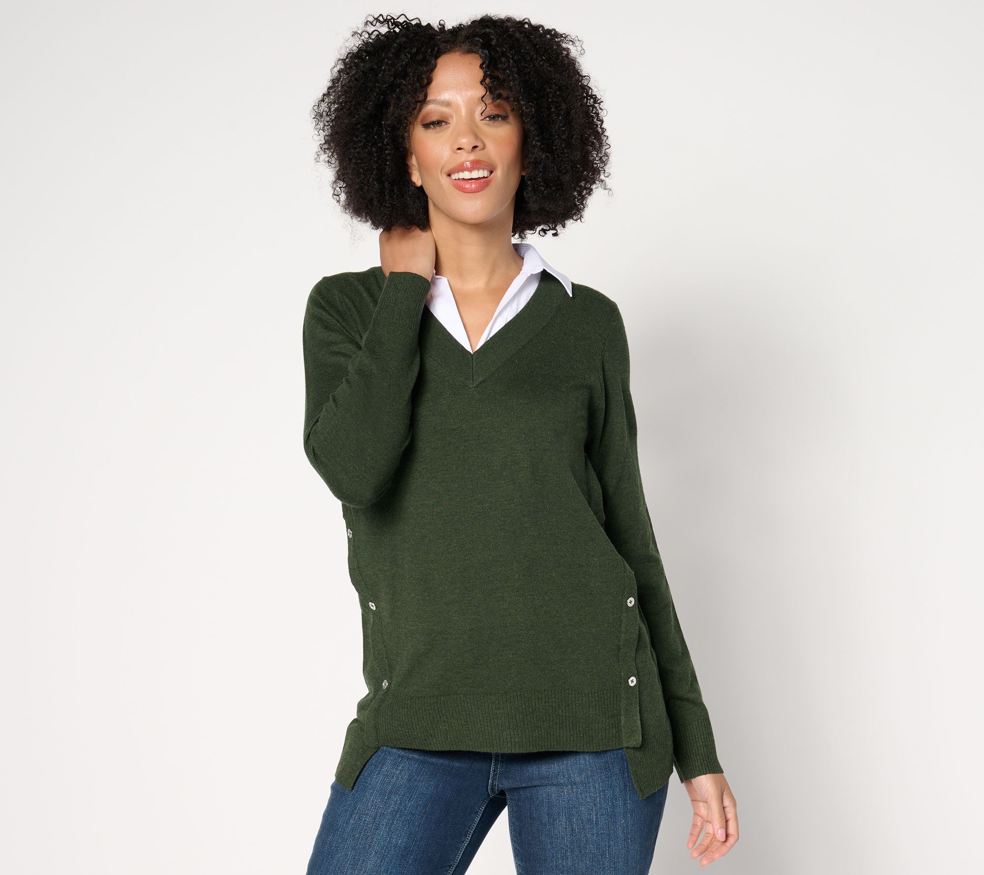 Love layered looks, but hate the lumpy silhouettes? By pairing a V-neck sweater with a poplin shirt collar, this singular style provides a polished appearance in a one-and-done design. From Denim & Co.® Fashions.