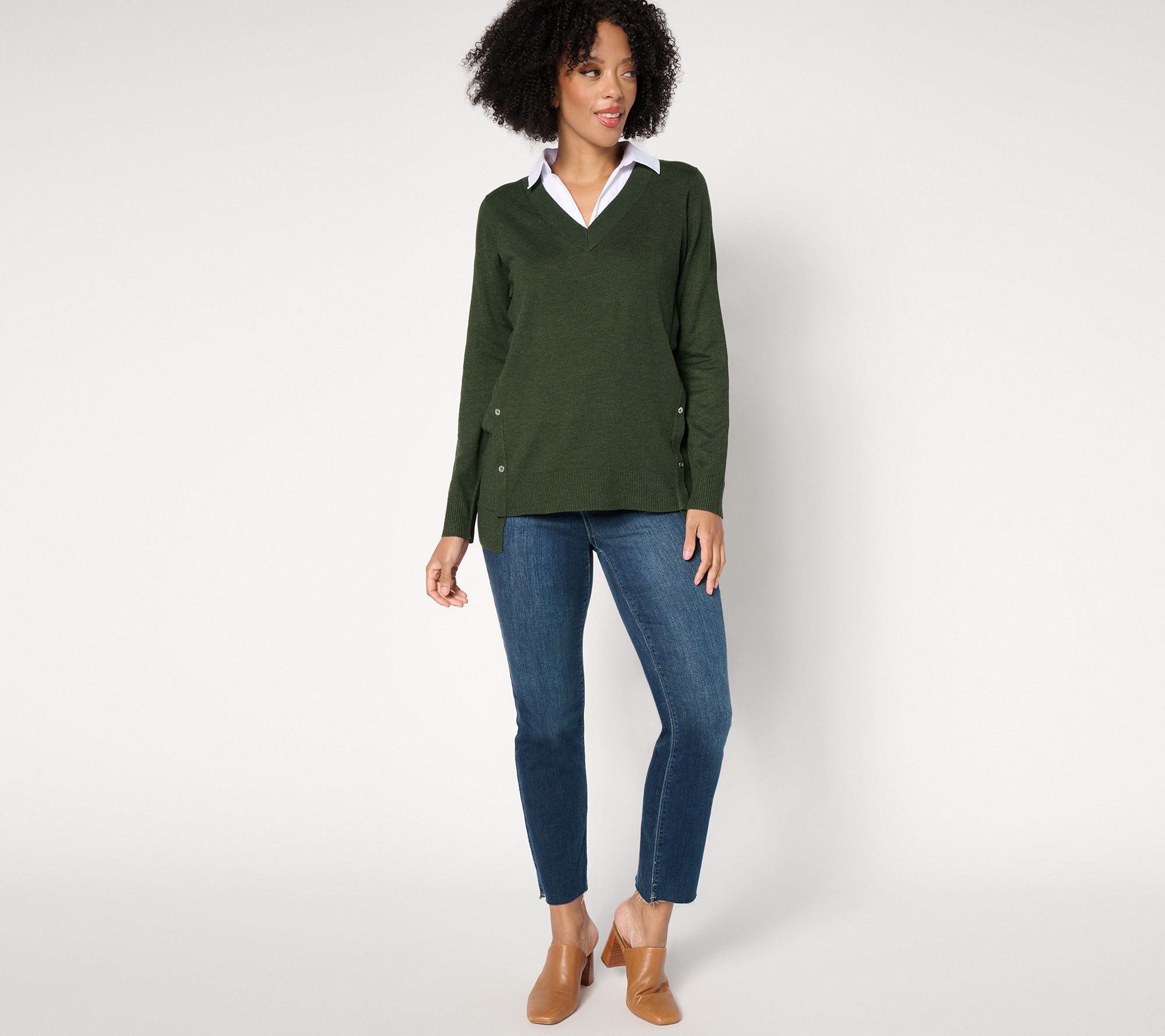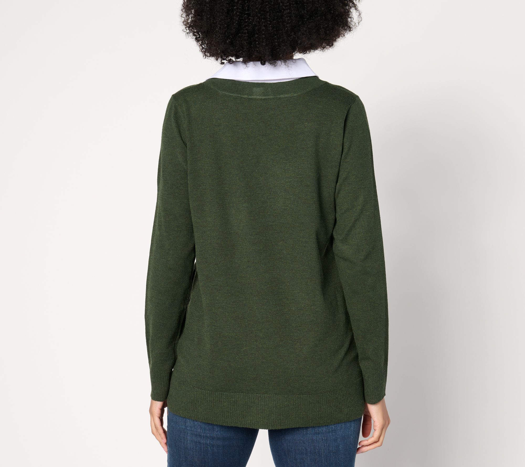 "As Is" Denim & Co. Collared 2fer V-Neck Sweater