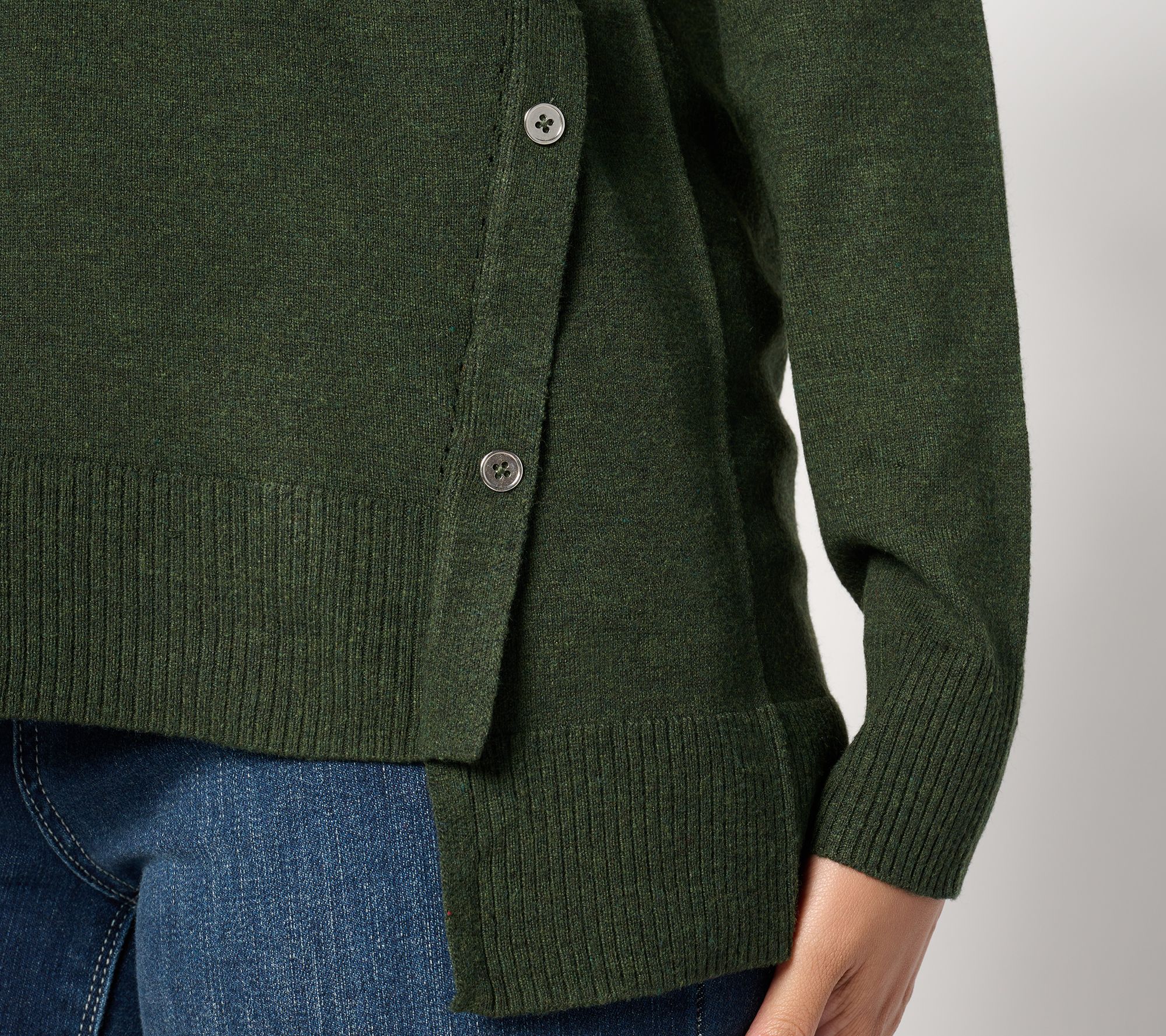 • Features: poplin shirt collar with turnback placket attached underneath V-neck tunic sweater; 2 x 2 ribbed cuff and hem on sweater; non-functional buttons across sweater front